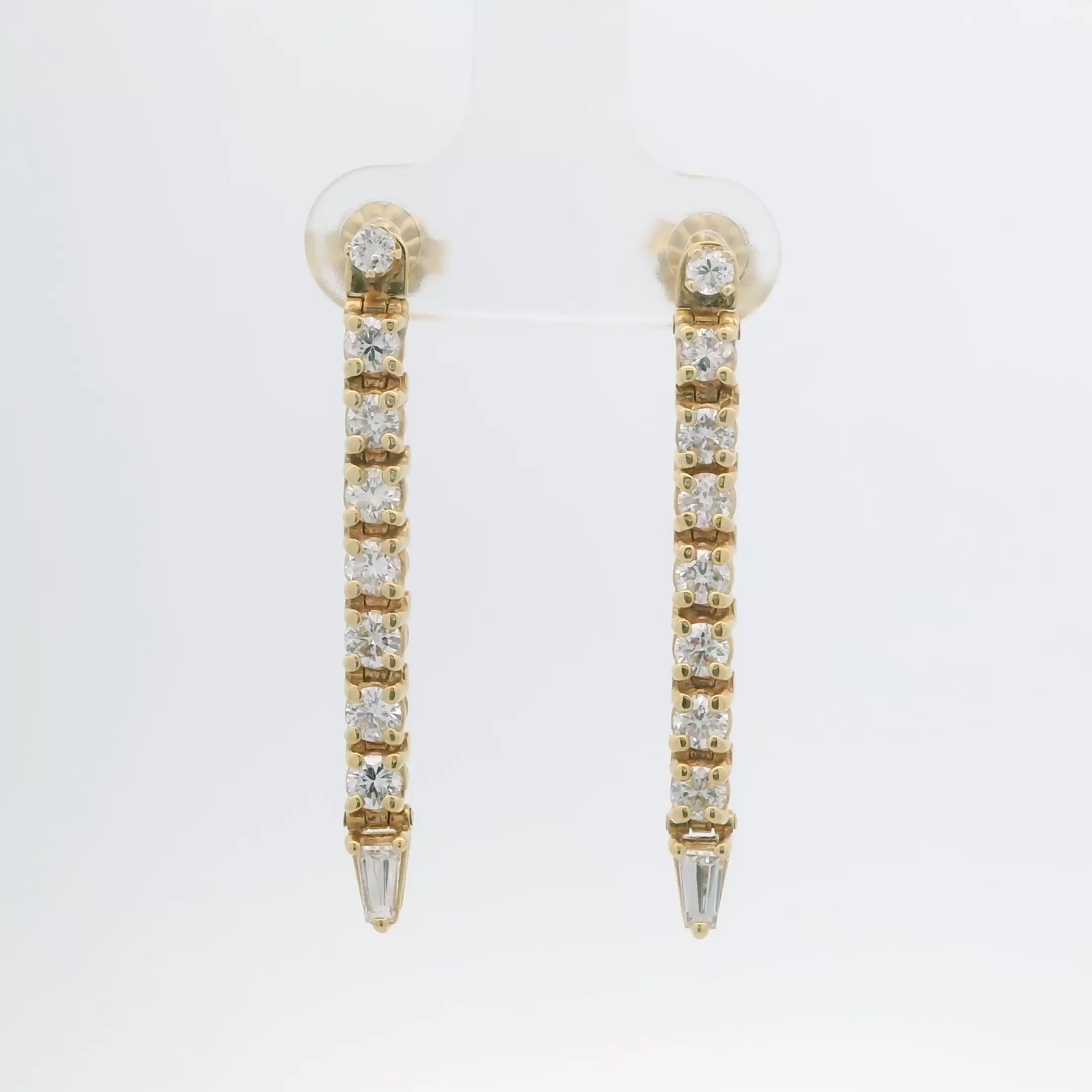 Elevate your everyday elegance with these 14k yellow gold diamond studs with drop style jackets, featuring 1.28 carats of brilliant round diamonds. The removable jacket design showcases tapered baguette ends totaling 0.24 carats, allowing you to transition seamlessly from classic studs to a sophisticated drop style. Versatile, timeless, and crafted for the modern woman who values both simplicity and refinement.