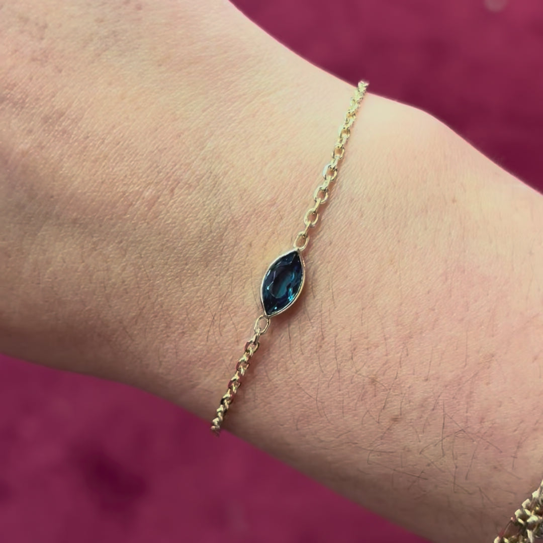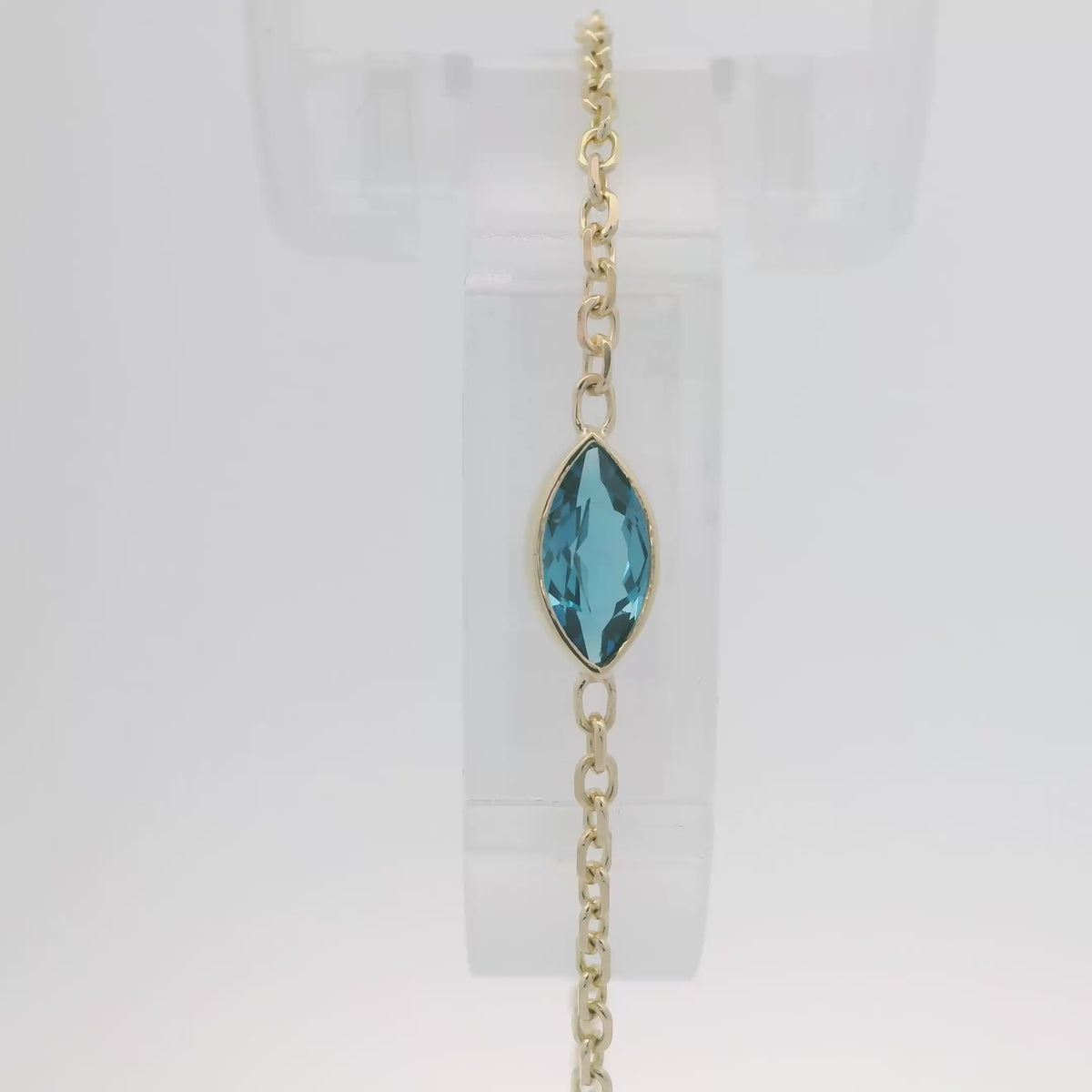 Elevate your jewelry collection with this sophisticated 14k yellow gold bracelet. The centerpiece showcases a stunning 10x5mm marquise-cut London blue topaz, expertly bezel set for secure, timeless elegance. Stationed gracefully along a delicate 2.1mm diamond-cut cable chain, this piece combines refined craftsmanship with understated luxury. Perfect for everyday wear or special occasions, it's a versatile addition that complements any style.