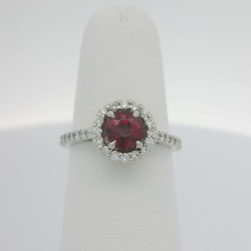 This exquisite ring features a brilliant 1.07-carat round ruby set in elegant white gold, surrounded by a diamond halo totaling 0.52 carats. Surrounding the ruby is a sparkling diamond halo that enhances its vibrant color, complemented by a diamond-studded band for added brilliance. Perfect for those seeking timeless sophistication and exceptional craftsmanship.