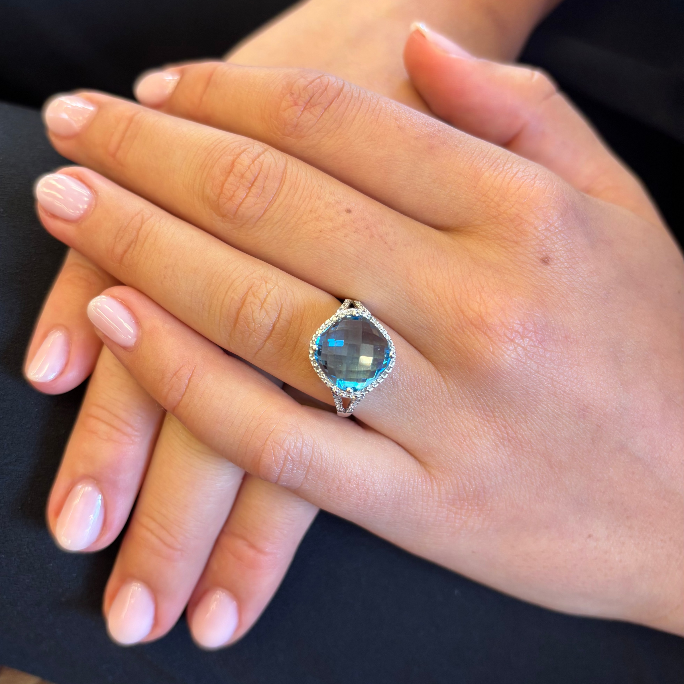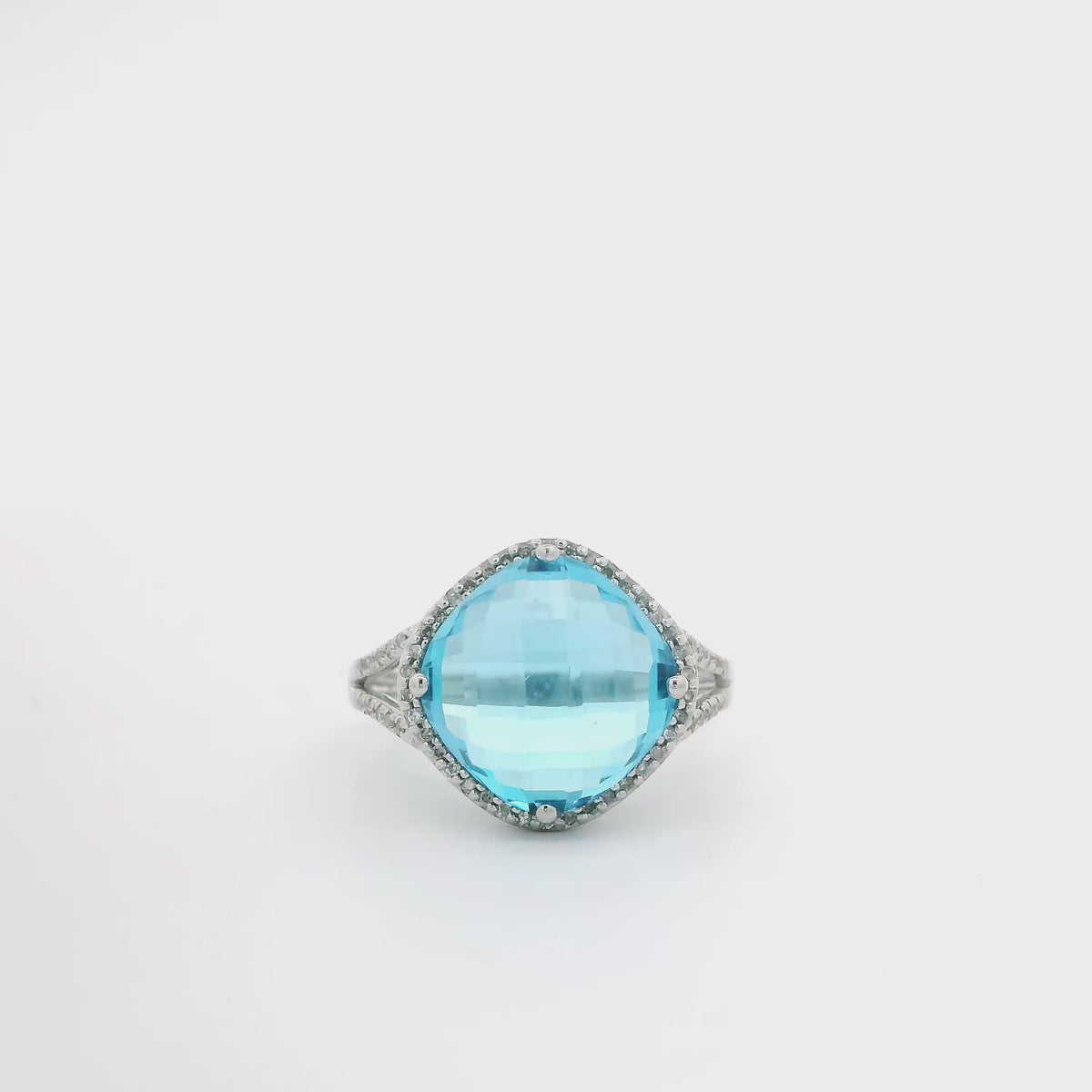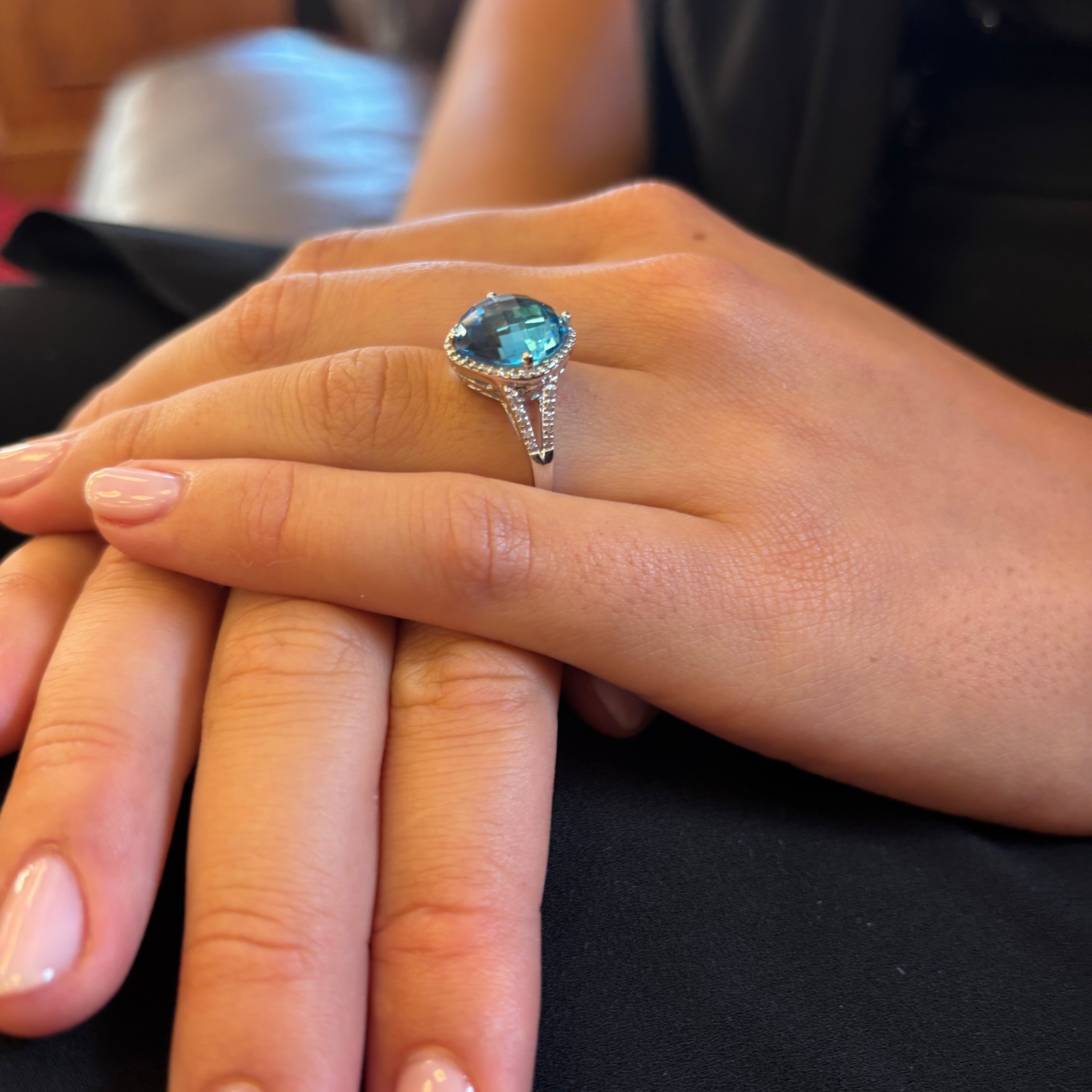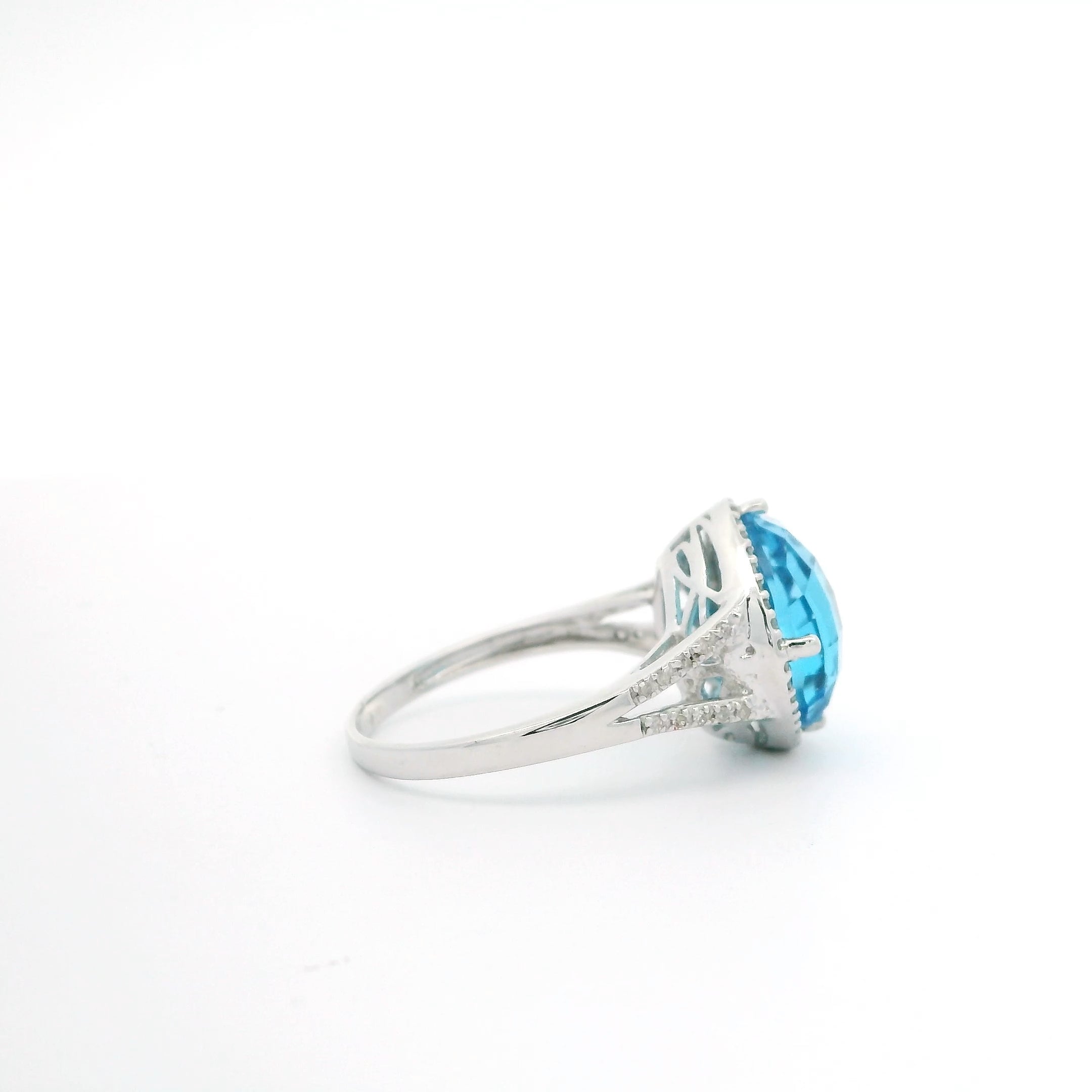 This elegant ring features a faceted checkerboard blue topaz set in 14k white gold, surrounded by a sparkling diamond halo. Its refined design highlights the vibrant blue gemstone, offering a timeless accessory that enhances any outfit with subtle sophistication. Perfect for special occasions or everyday elegance.