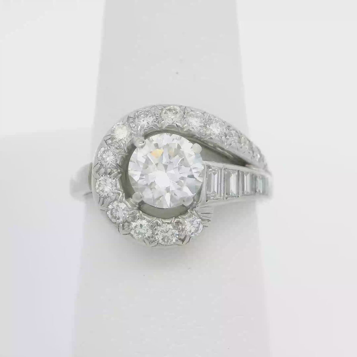 This vintage diamond ring features a stunning 0.95-carat center diamond, complemented by a total of 0.45 carats in baguette diamonds and 0.35 carats in single-cut round diamonds. Crafted in platinum, the ring showcases high-quality G color and VS1-VS2 clarity diamonds, totaling 1.75 carats. Expertly designed and in excellent condition, this piece offers enduring elegance and refined craftsmanship.