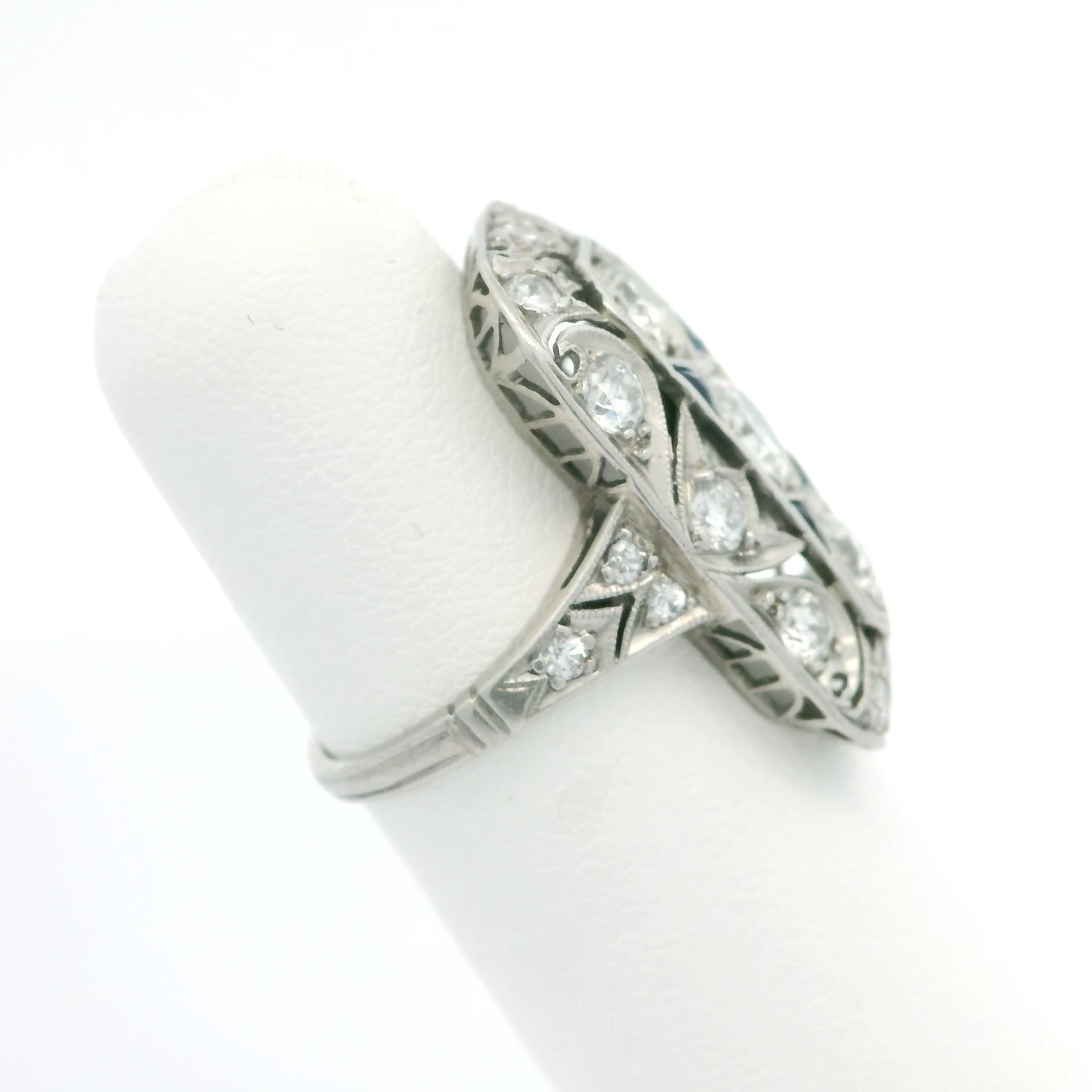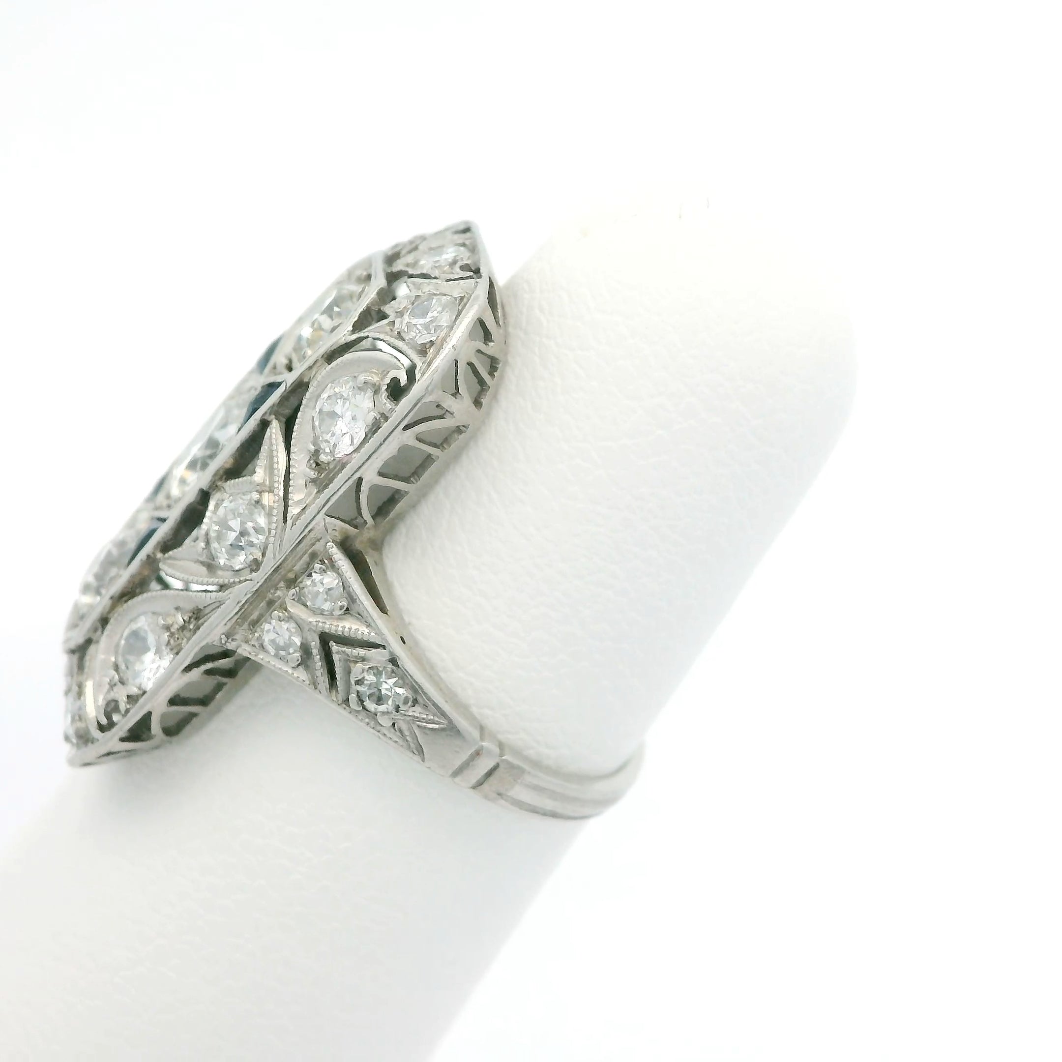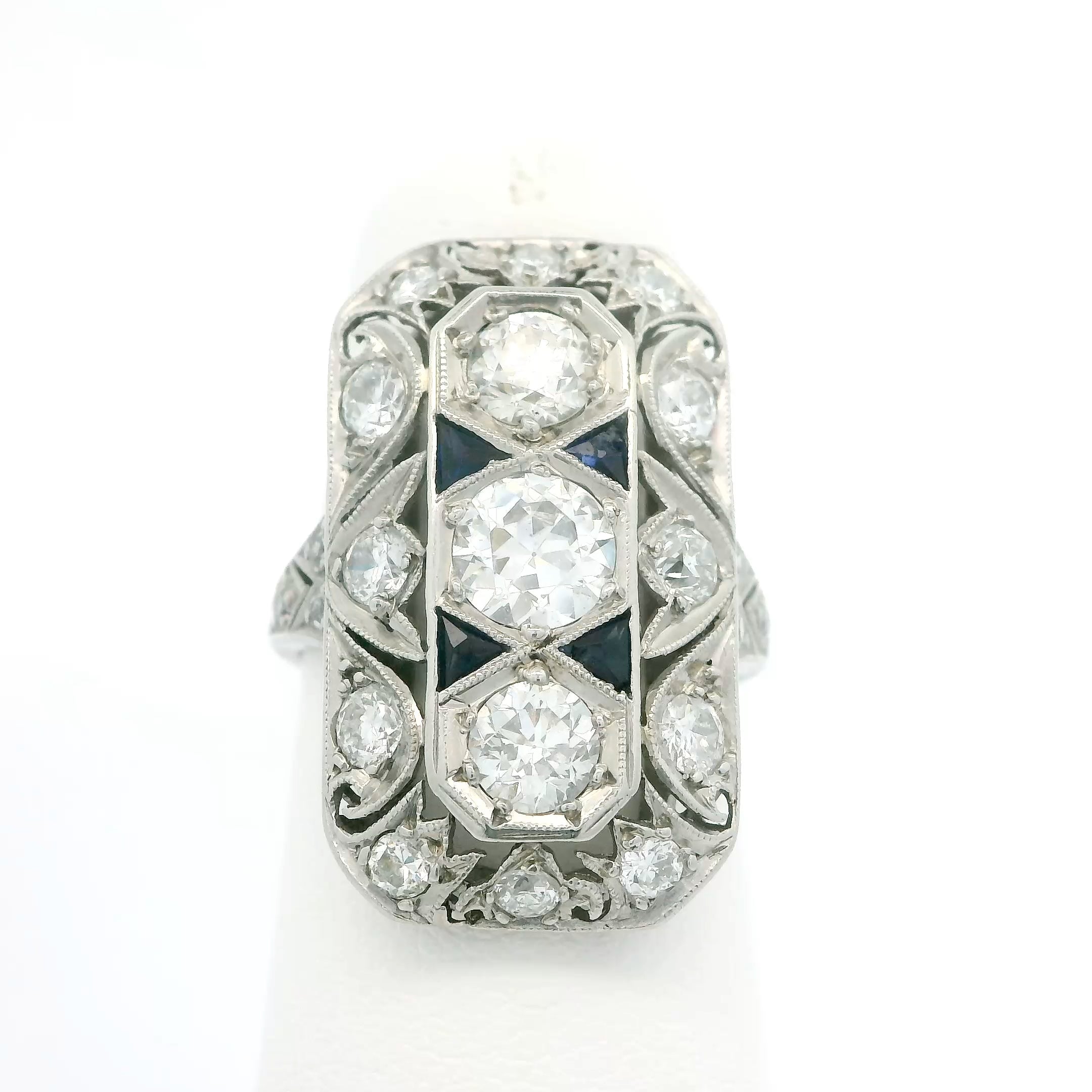 This exquisite Art Deco ring features approximately 2.00 carats of carefully selected diamonds set in a platinum band, accented by vibrant sapphire details. Its geometric design reflects the elegance of the Art Deco era, combining timeless sophistication with a striking visual appeal. Perfect for those who appreciate vintage fine jewelry.