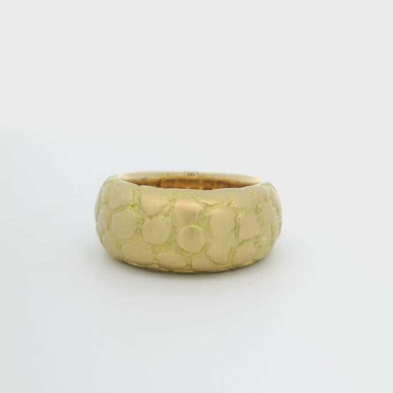 Crafted from 18k yellow gold, this snake scale ring in size 6.75 features a 9.8mm wide band that showcases intricate detailing. Its textured design combines sophistication with a touch of boldness, making it a distinctive piece for any collection. The ring offers both durability and comfort for daily wear or special occasions.