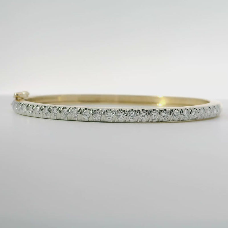 This elegant Two Tone Diamond Bangle features 14 karat white gold setting for the top half, showcasing 26 brilliant diamonds totaling 0.78 carats with G color and VS2 clarity. The bottom half is crafted in rich 14 karat yellow gold, offering a sophisticated contrast that highlights the sparkle of each diamond. Combining timeless design with expert craftsmanship, this bangle adds refined luxury to any collection.
