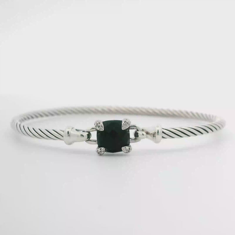 This David Yurman Onyx Bangle is a sterling silver designer piece characterized by its elegant hook clasp, ensuring secure and effortless wear. Crafted with attention to detail, it offers a sophisticated accessory that complements any style with timeless refinement.