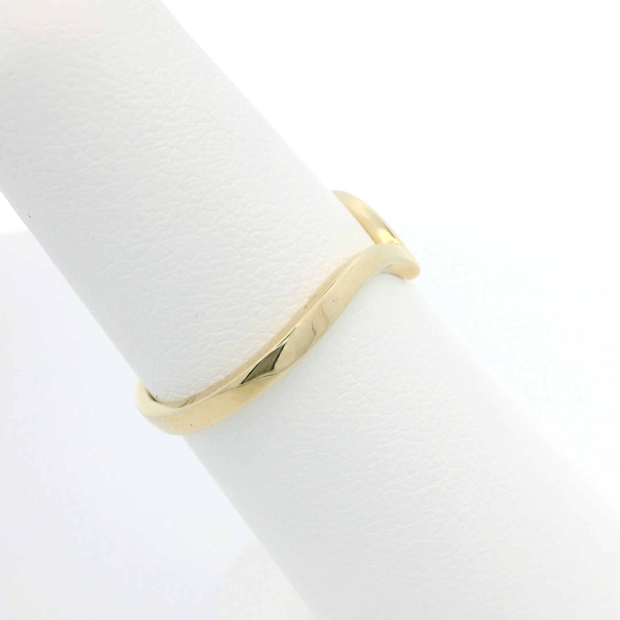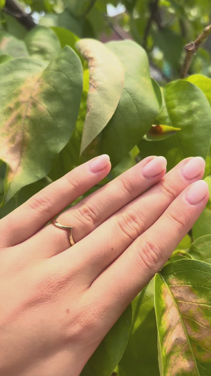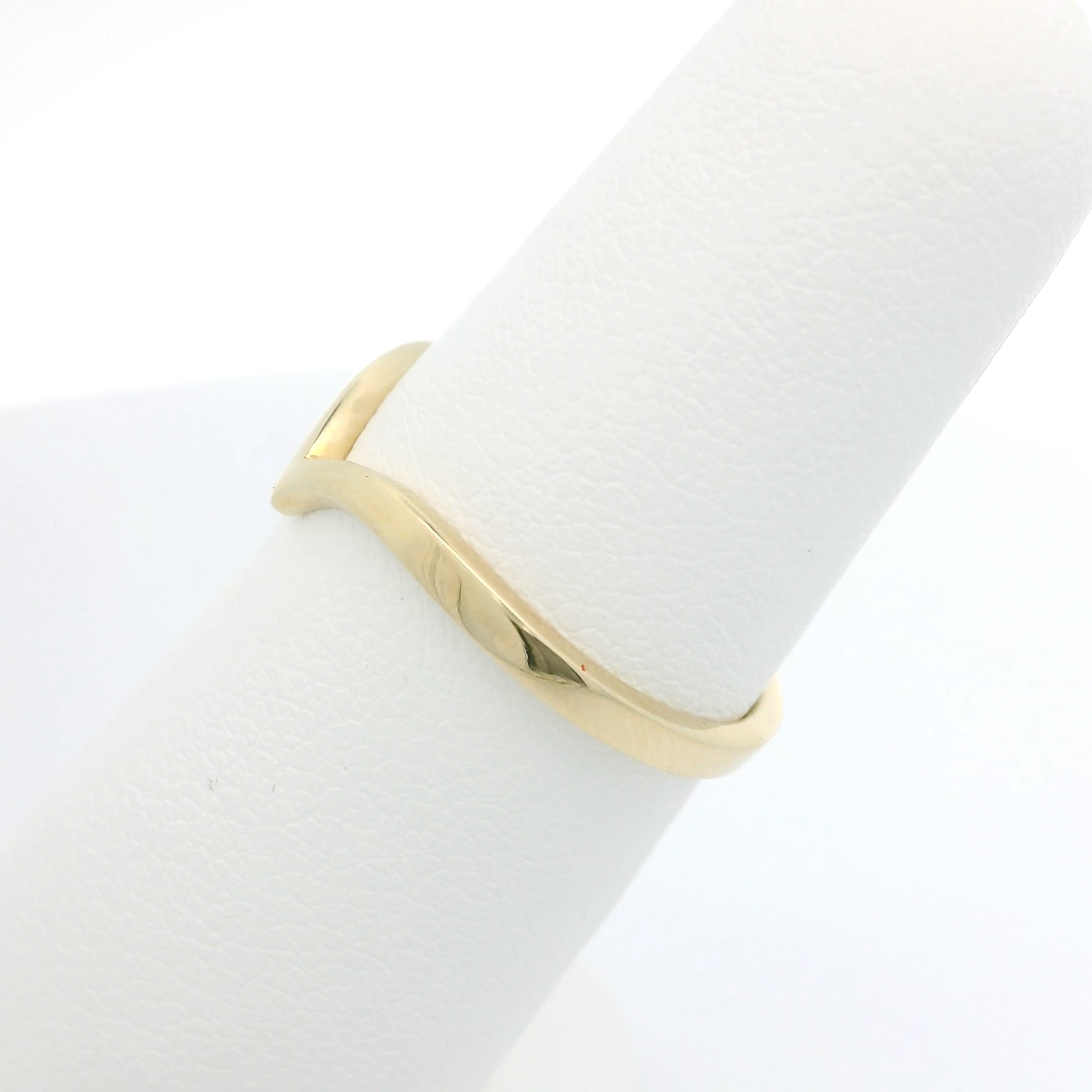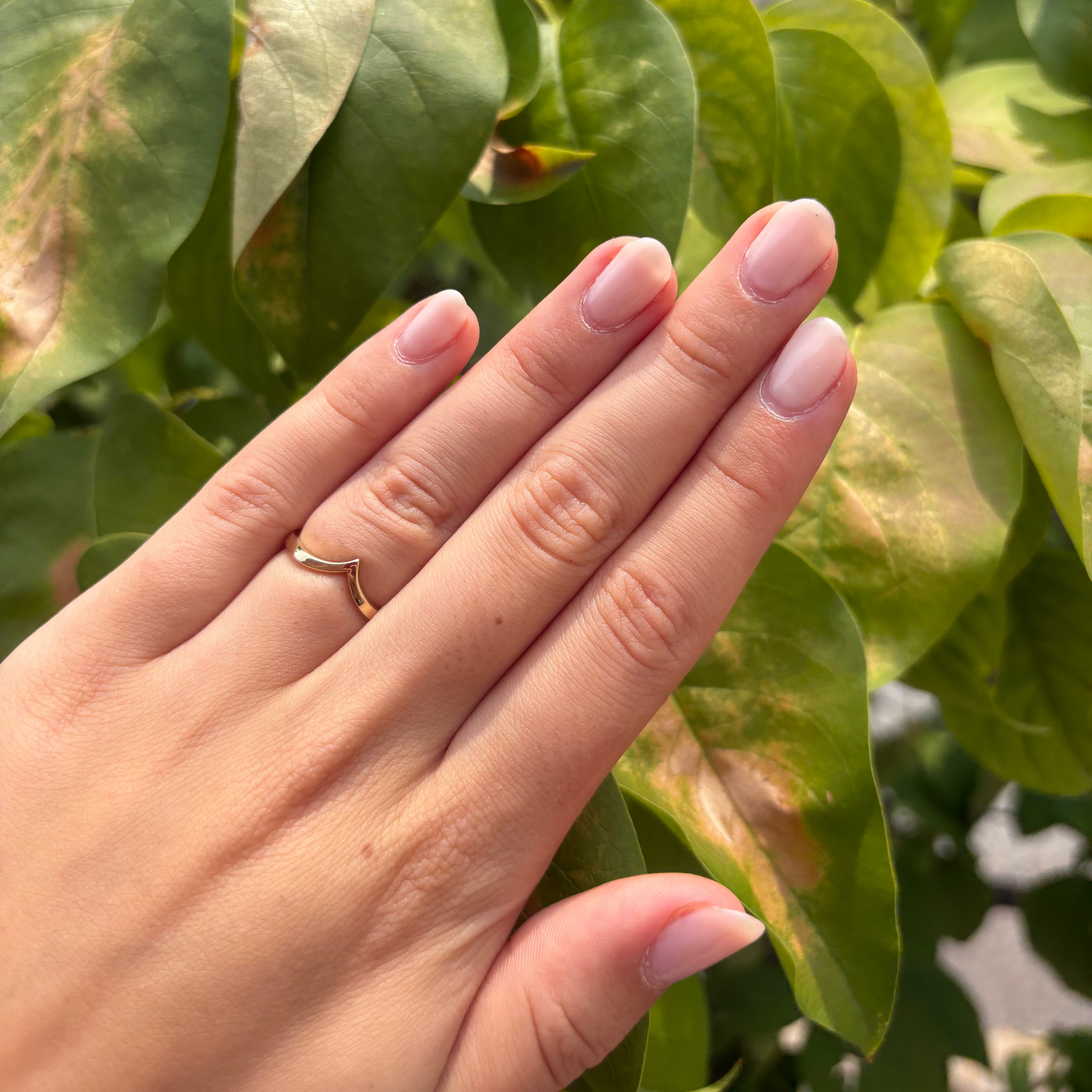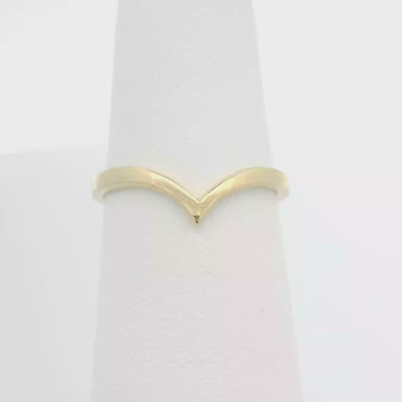 This yellow gold V-shape ring is designed to perfectly complement larger center stones, making it an ideal wedding band to pair with your engagement ring. Its elegant chevron design also allows it to be worn alone for a refined, minimalist look. Crafted to enhance and harmonize with your existing jewelry, this ring offers both versatility and timeless style.