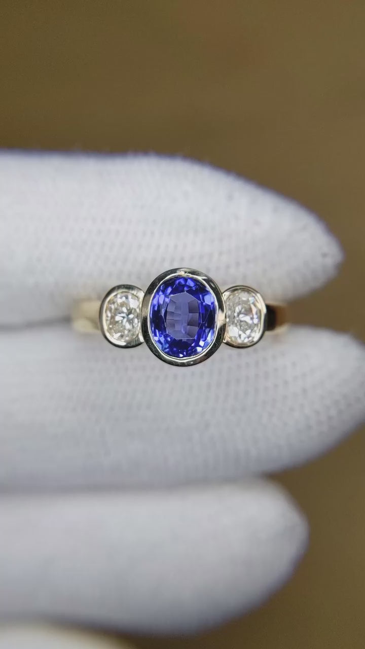 This 3 Stone Tanzanite Ring features a stunning oval-shaped tanzanite center stone weighing 1.048 carats, complemented by two oval-shaped diamonds with a total weight of 0.65 carats. All three stones are securely bezel set, offering a sleek, elegant design that ensures durability and highlights the vivid colors of the gemstones. Perfect for those seeking a sophisticated and timeless piece.