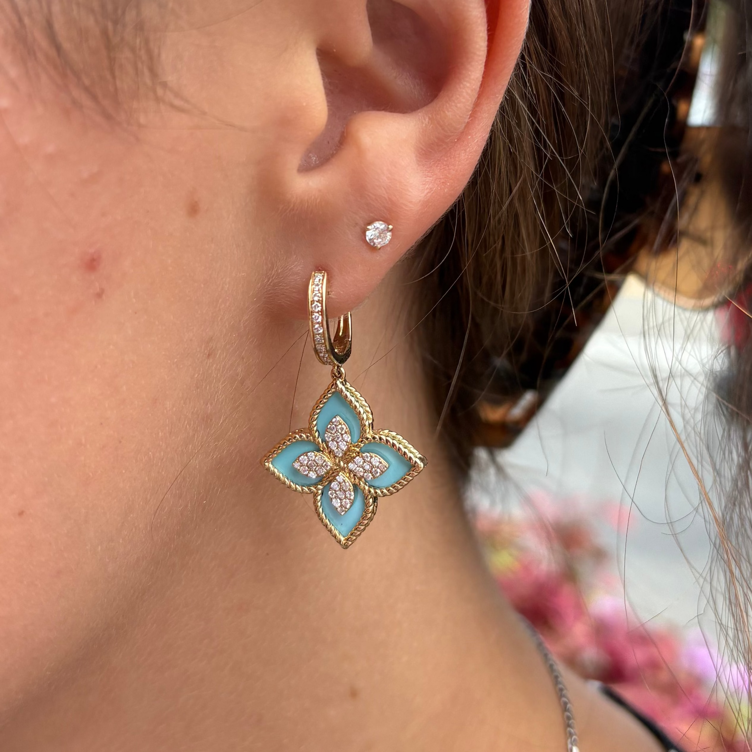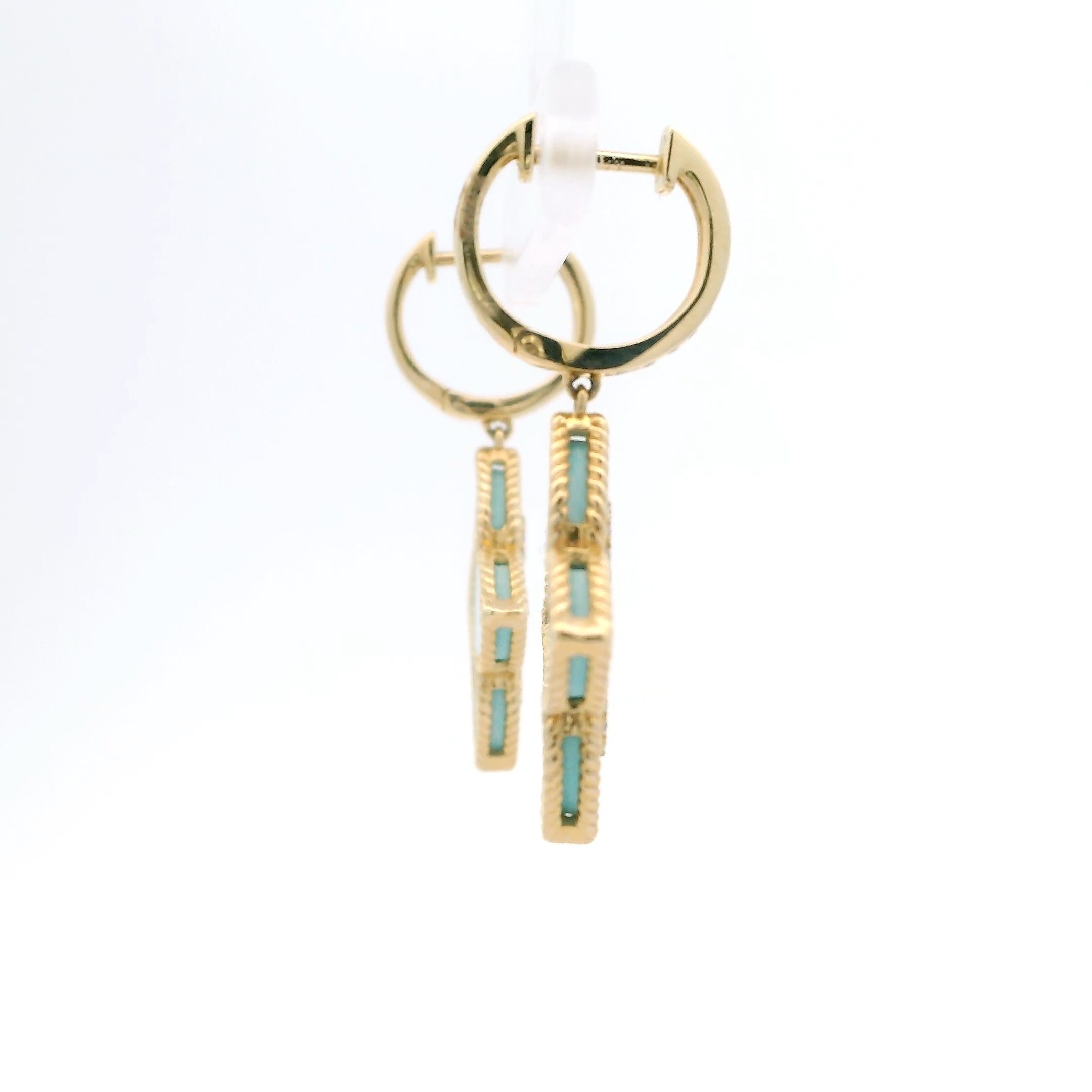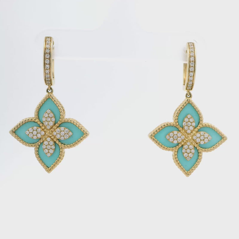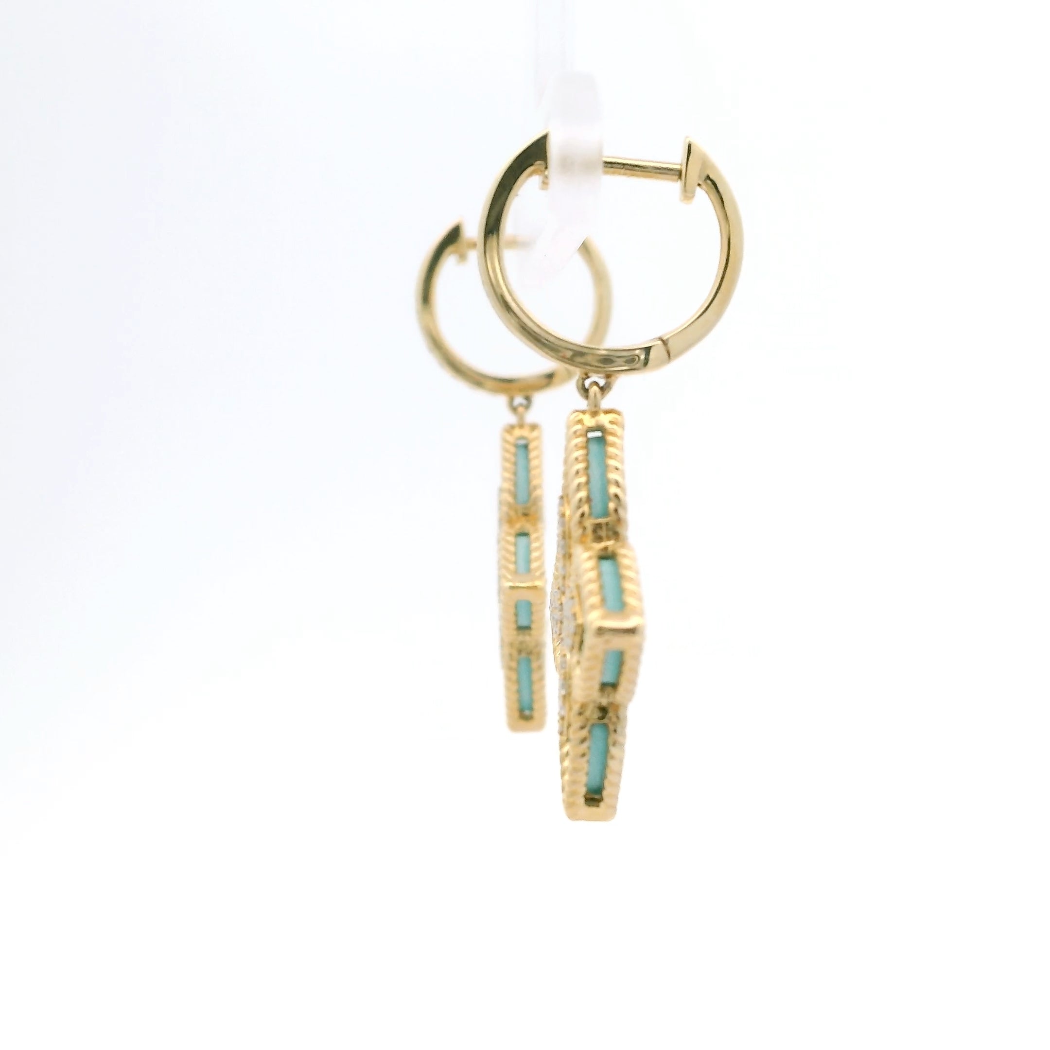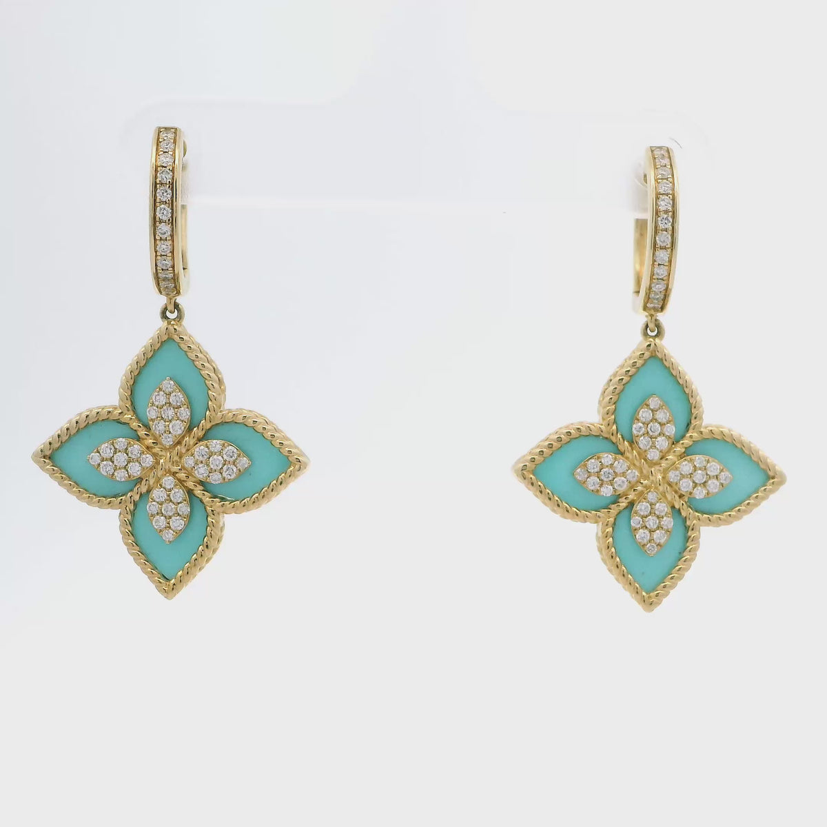 These Turquoise and Diamond Dangle Earrings feature a total of 5.02 carats of vibrant turquoise, complemented by 96 sparkling diamonds totaling 0.41 carats. Inspired by delicate floral designs, they offer an elegant and refined look perfect for adding a touch of sophistication to any outfit.