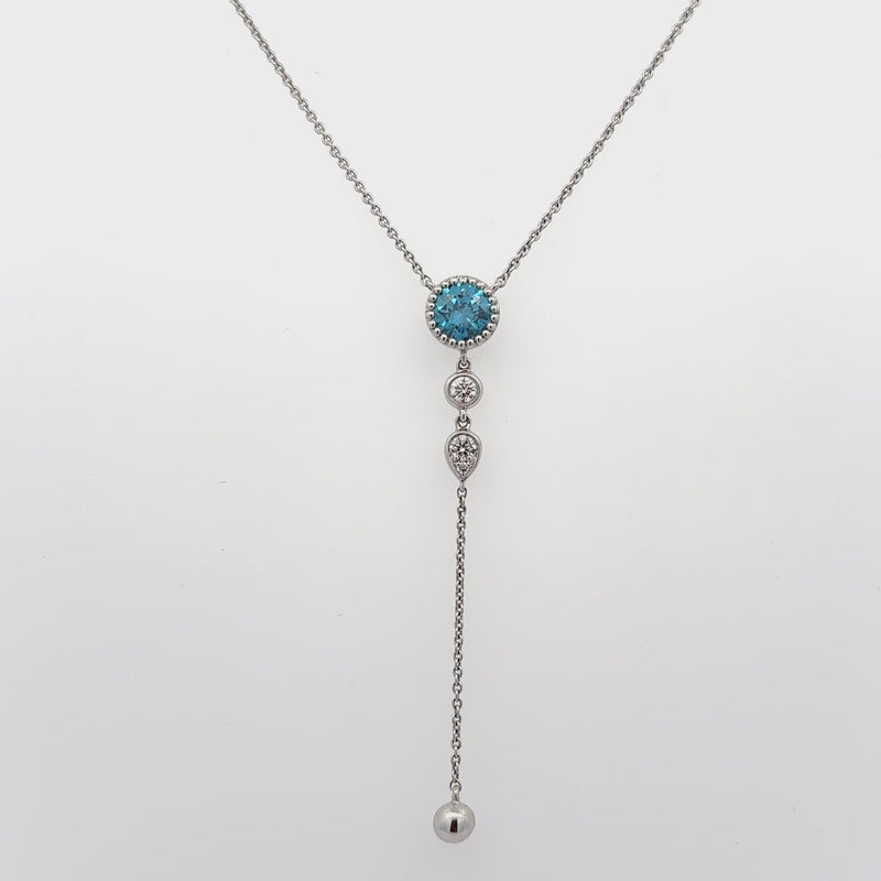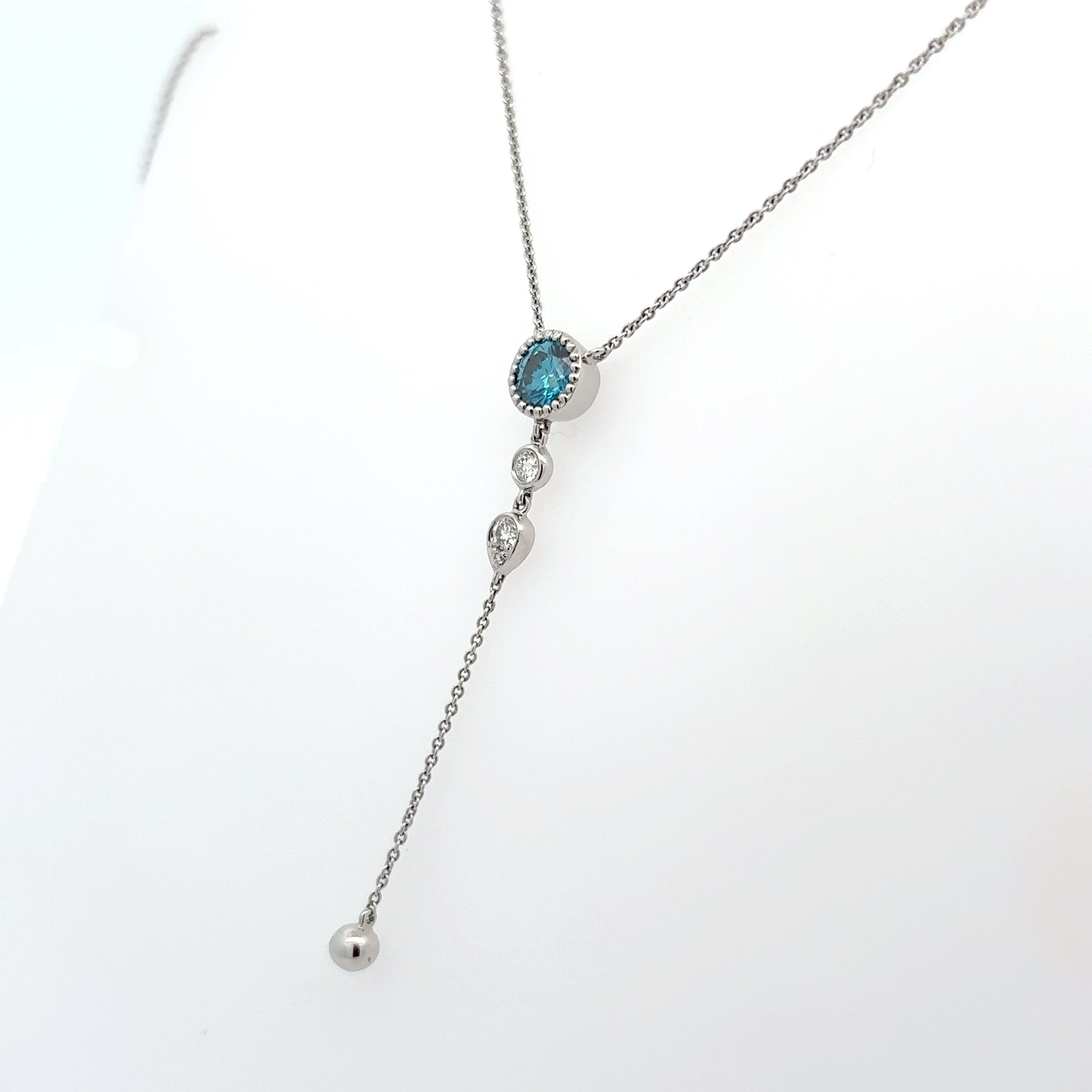 This elegant necklace showcases a 0.55-carat round blue diamond accented by three white diamonds totaling 0.09 carats. Crafted in 14k white gold, its refined design highlights the vibrant contrast and timeless beauty of the gemstones, perfect for adding a sophisticated touch to any outfit.