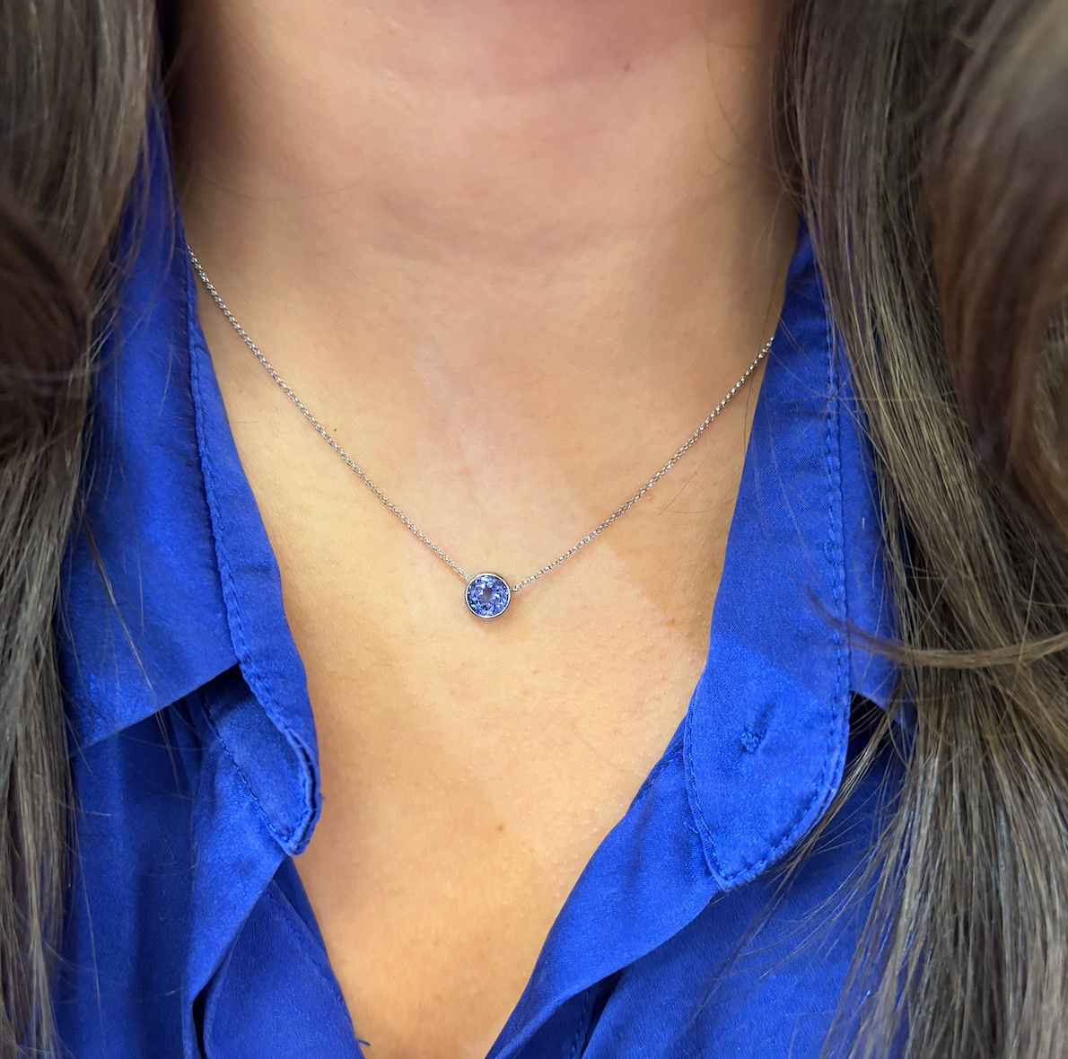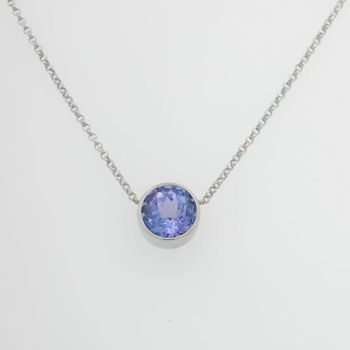 This elegant necklace features a bezel-set, round-cut tanzanite weighing 6.60 carats, beautifully showcased at the center of a 14k white gold chain. The striking blue-violet gemstone’s secure setting highlights its clarity and brilliance, making it a timeless piece suitable for both everyday wear and special occasions.