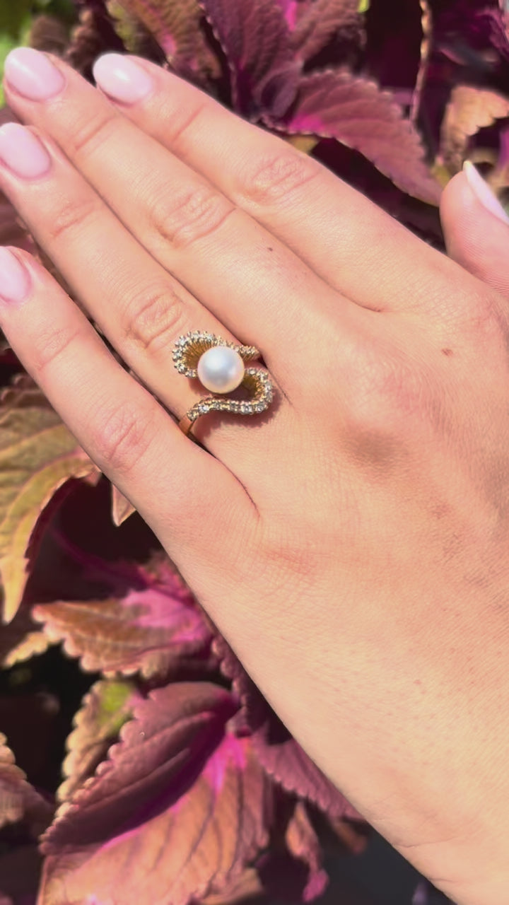 This elegant Fancy Pearl Ring features a lustrous 7.5mm pearl set in 14k yellow gold, complemented by 20 round diamonds totaling 0.32 carats. Its refined design combines classic sophistication with subtle sparkle, making it a timeless addition to any jewelry collection.