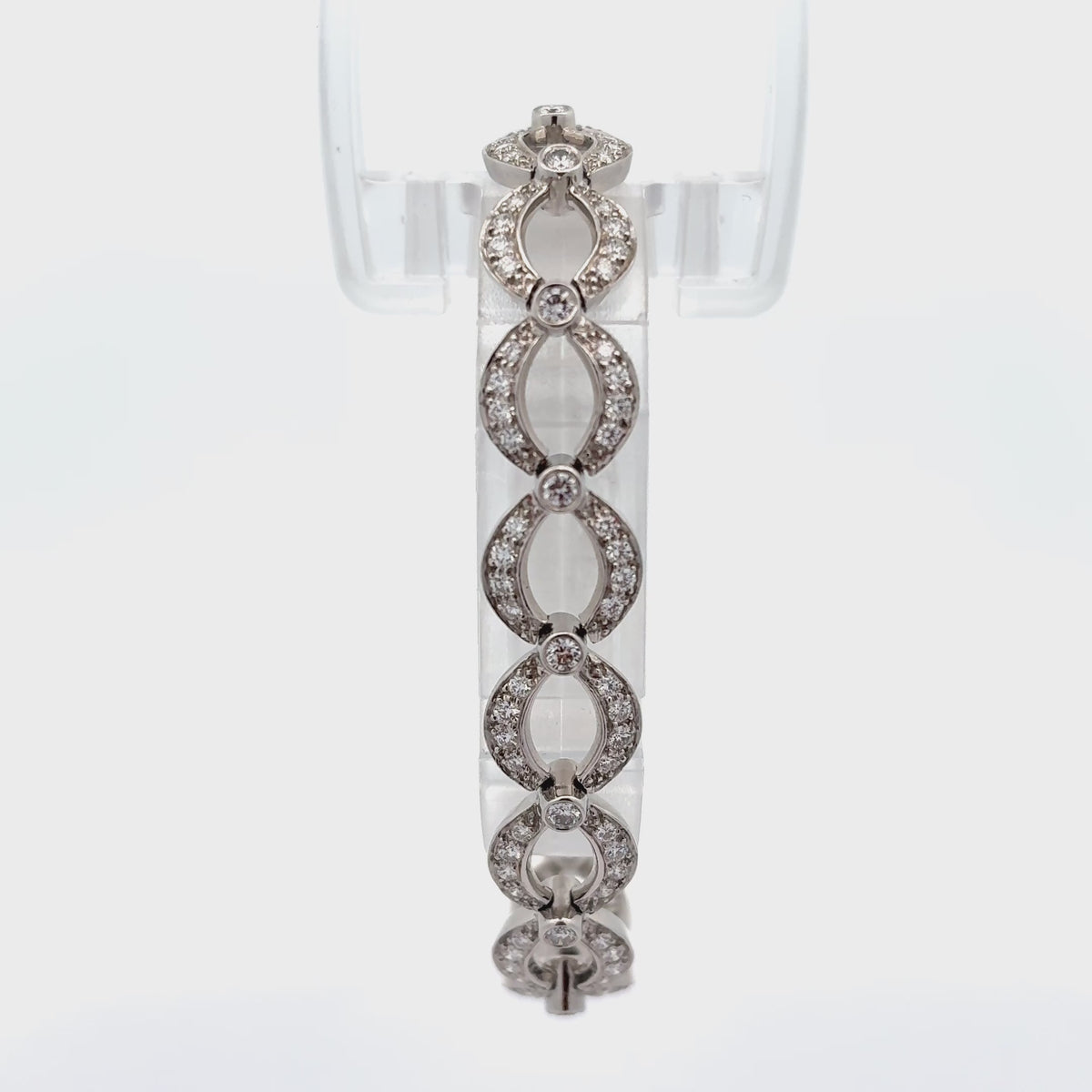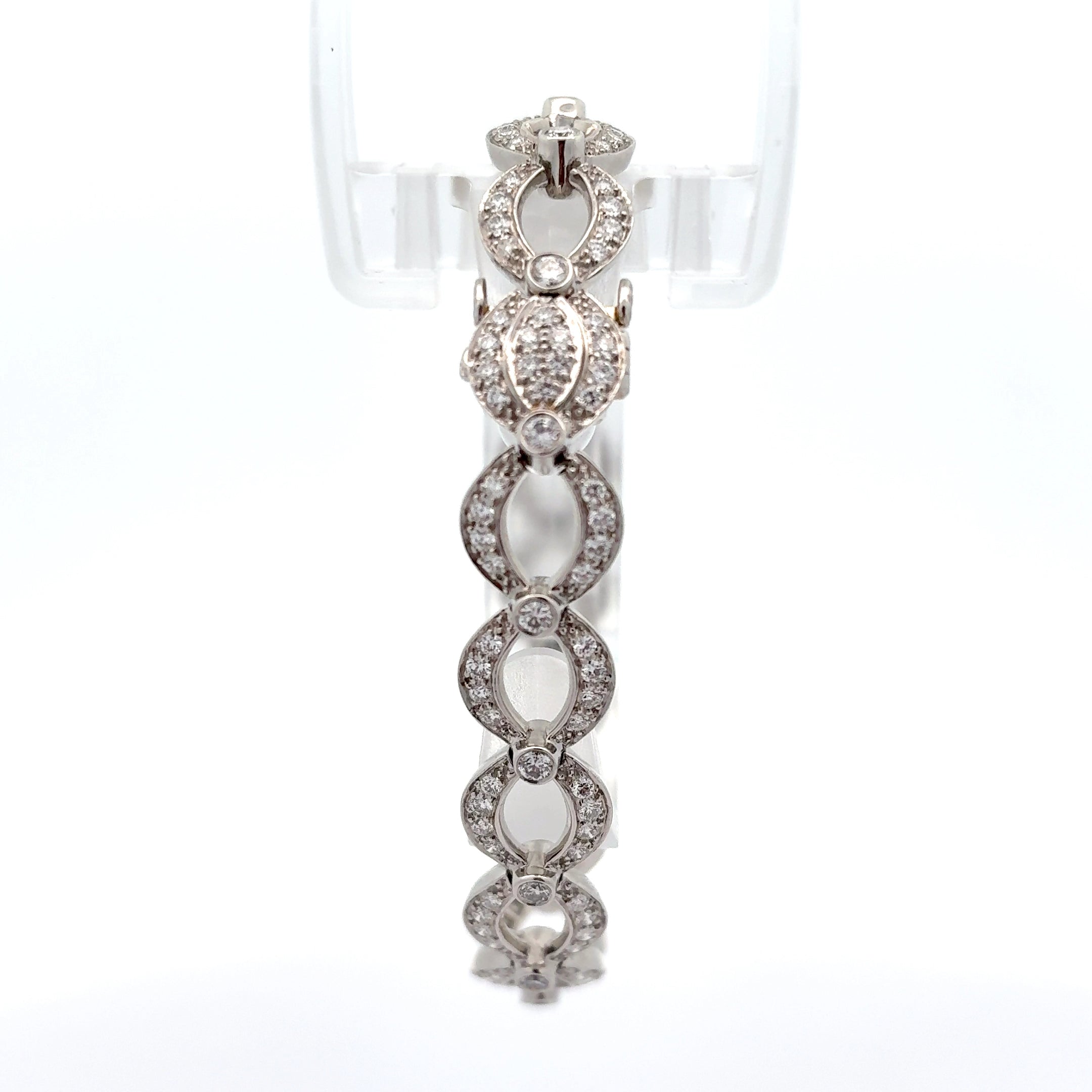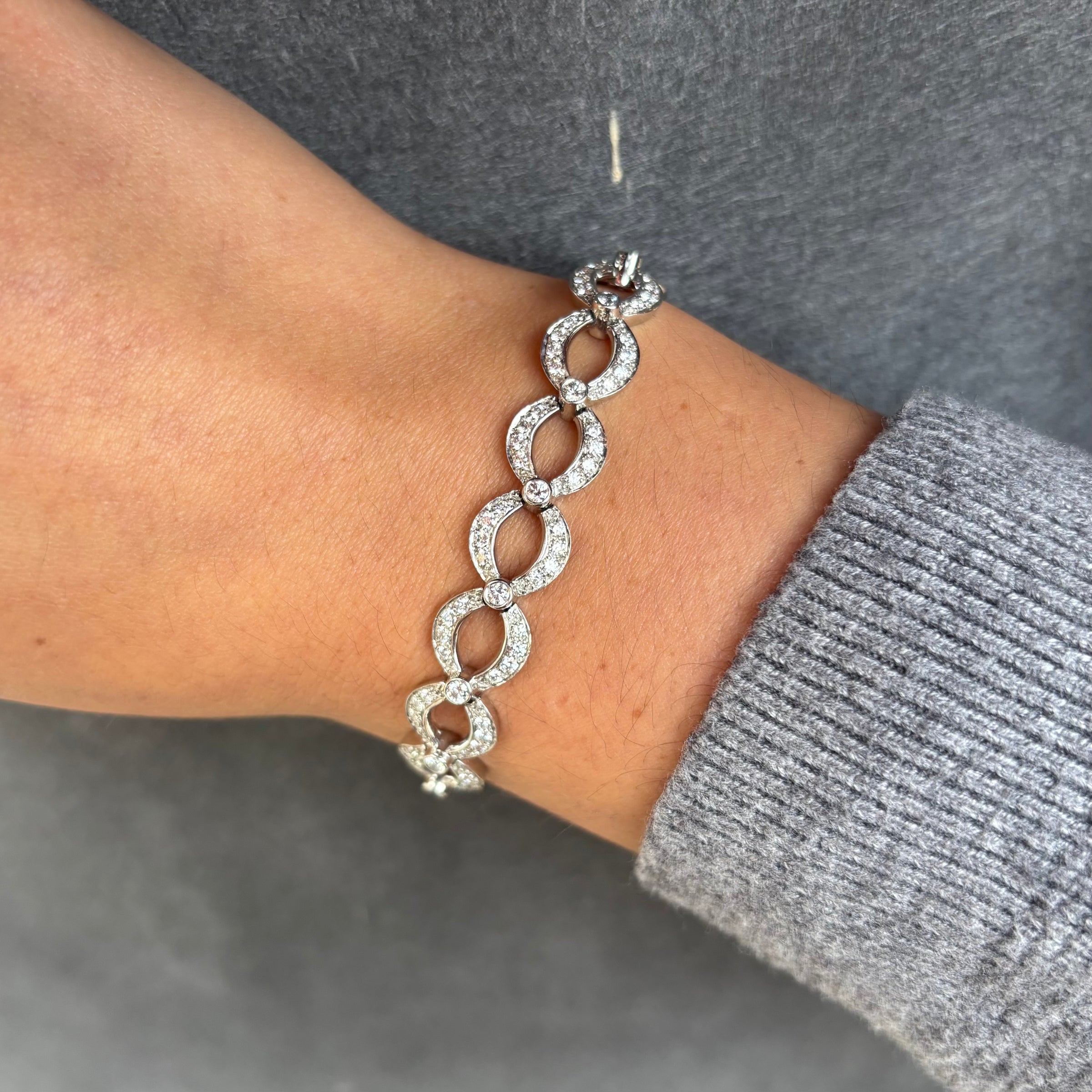 This platinum open link bracelet features 16 larger round diamonds totaling 0.87 carats, complemented by 134 smaller diamonds adding up to 2.68 carats. The combination of meticulously set stones creates a refined and elegant piece, perfect for adding sophisticated sparkle to any occasion. Crafted with precision, this bracelet offers both durability and timeless style.