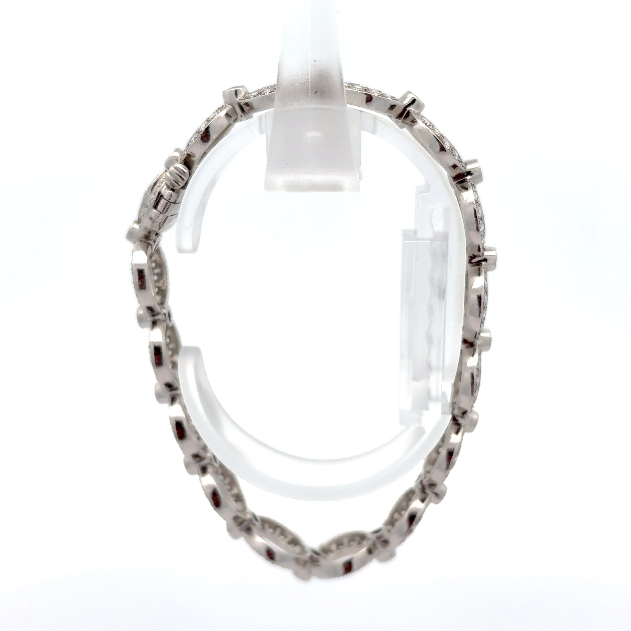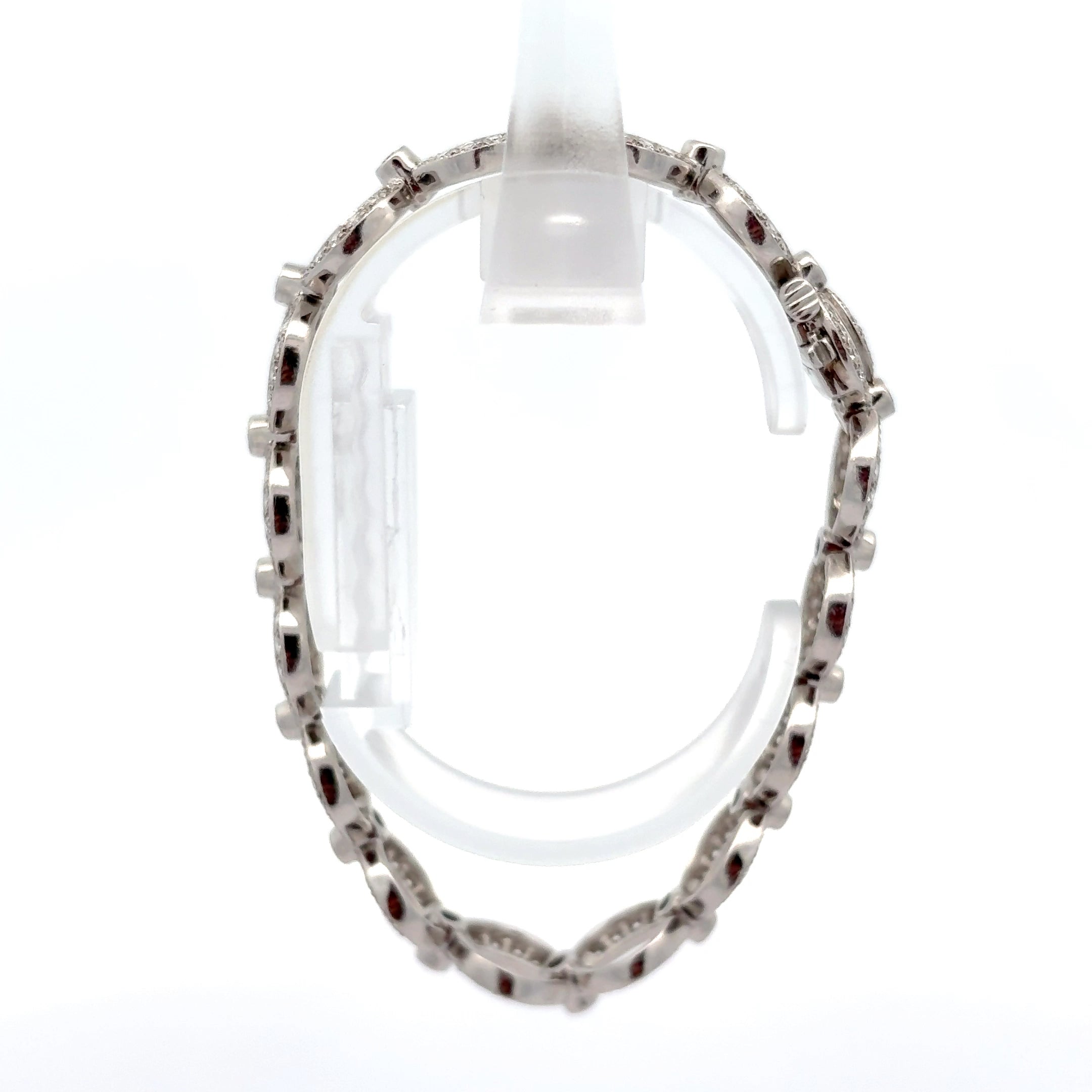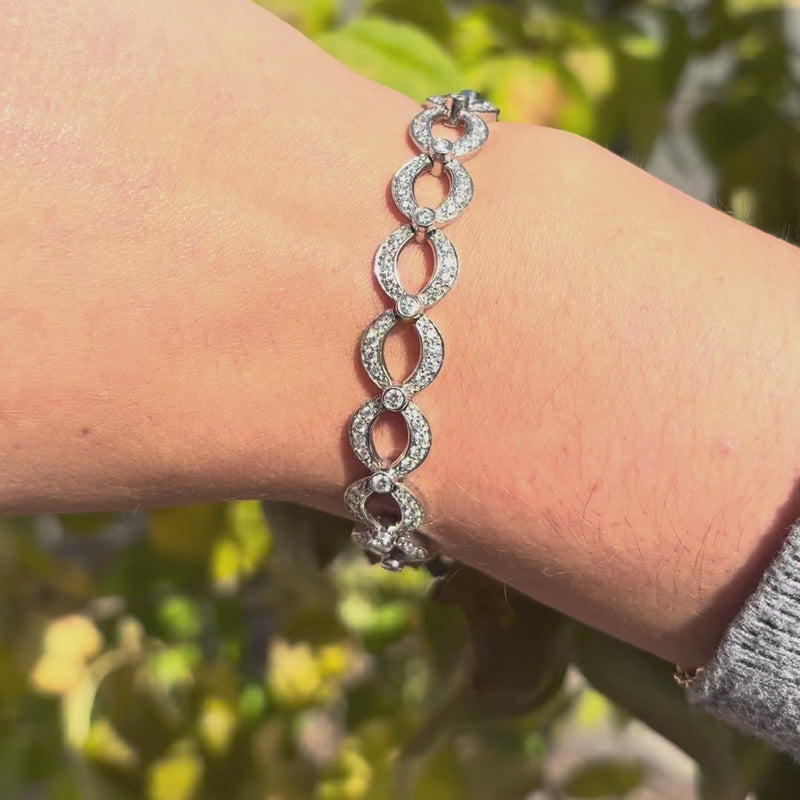 This platinum open link bracelet features 16 larger round diamonds totaling 0.87 carats, complemented by 134 smaller diamonds adding up to 2.68 carats. The combination of meticulously set stones creates a refined and elegant piece, perfect for adding sophisticated sparkle to any occasion. Crafted with precision, this bracelet offers both durability and timeless style.