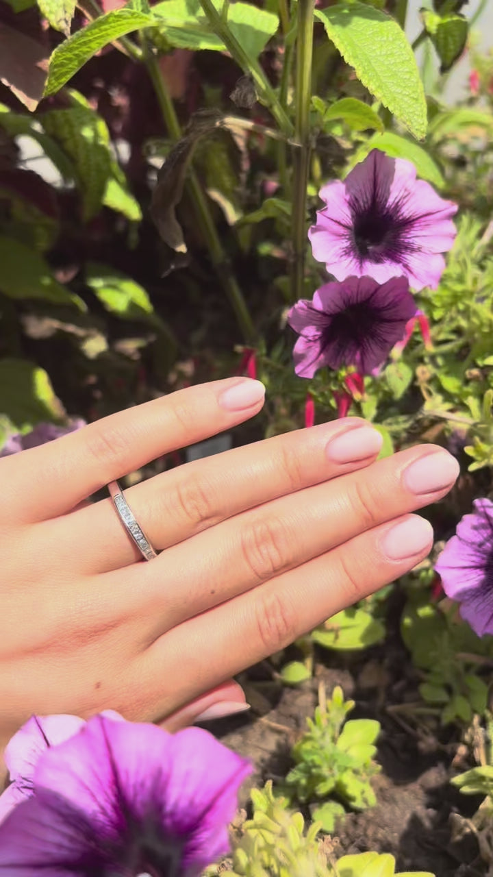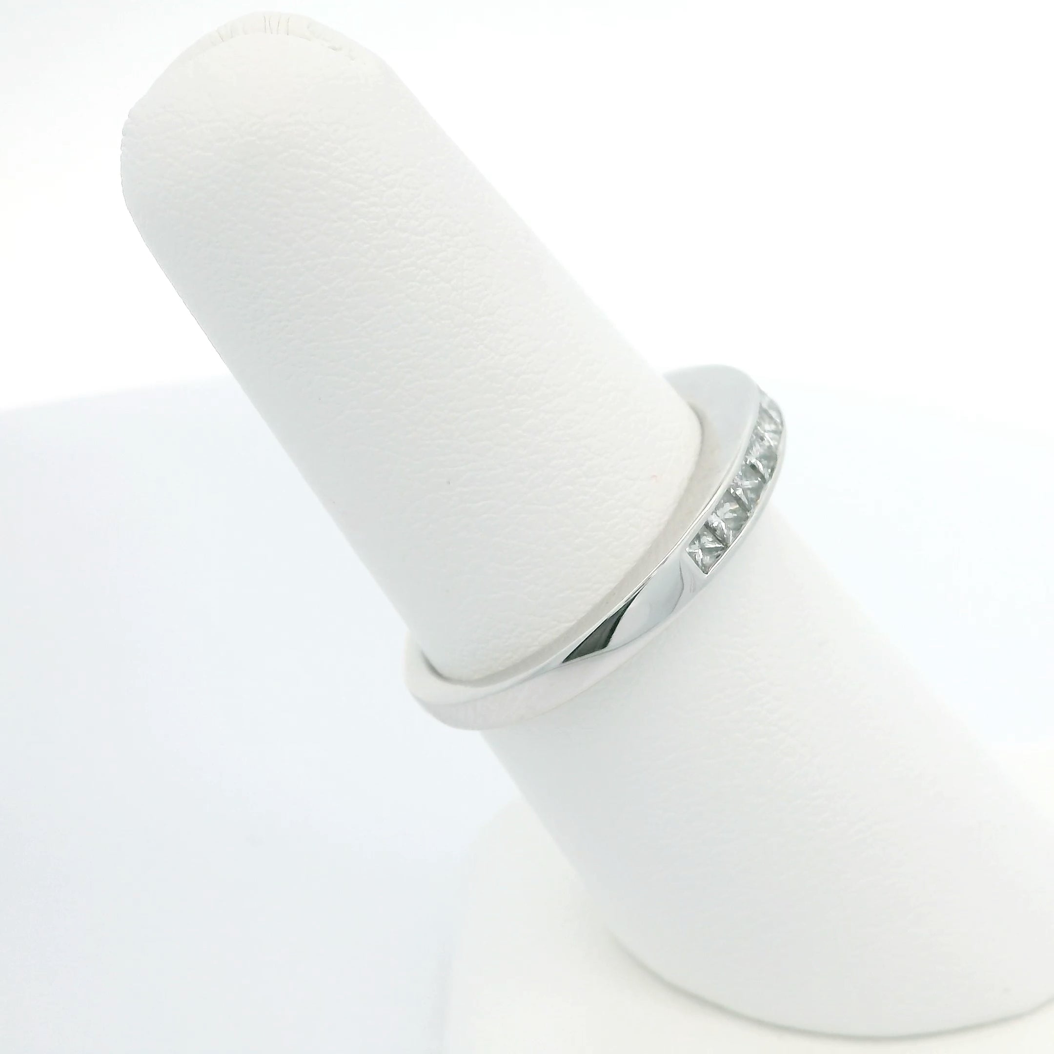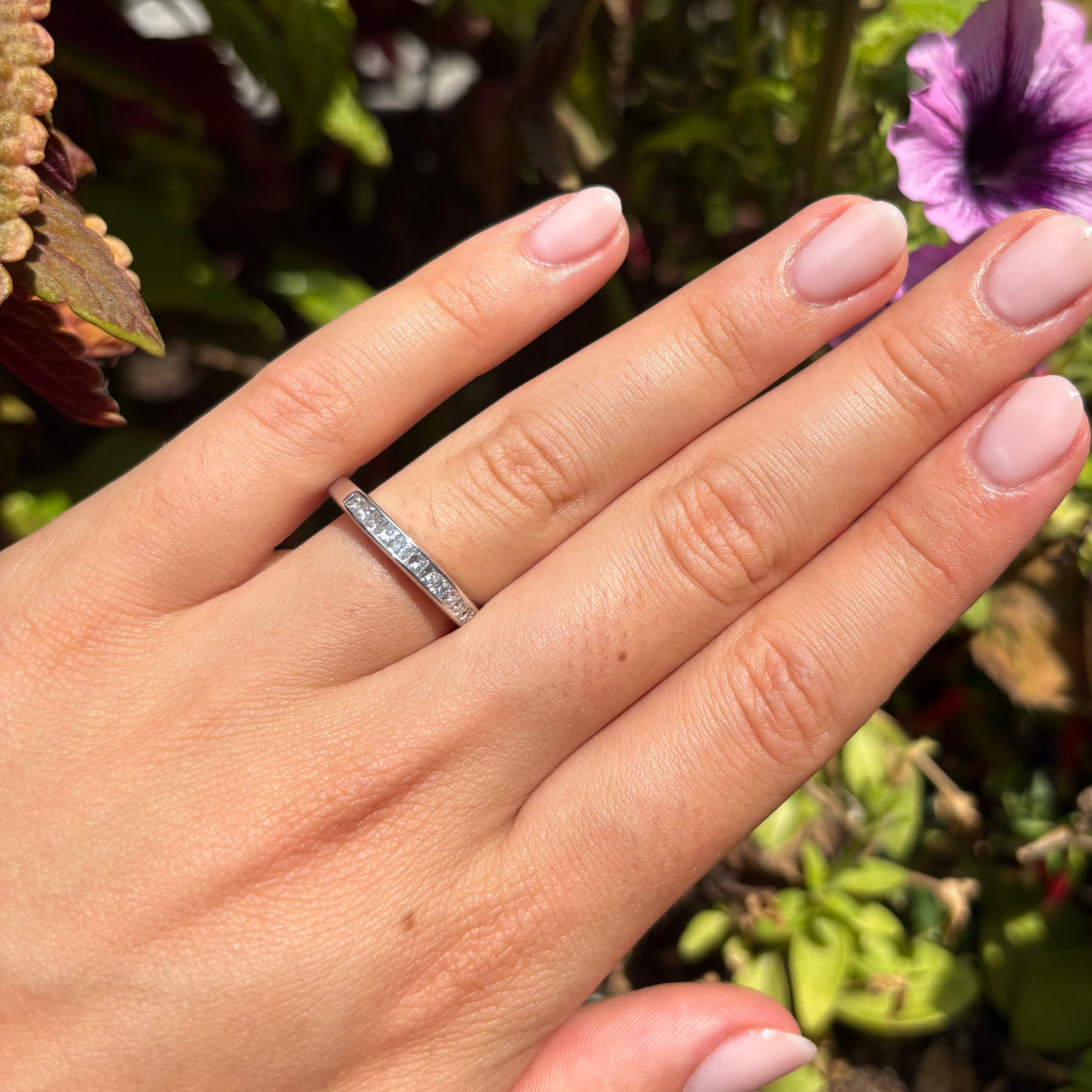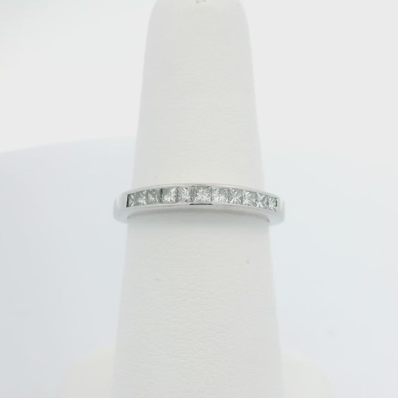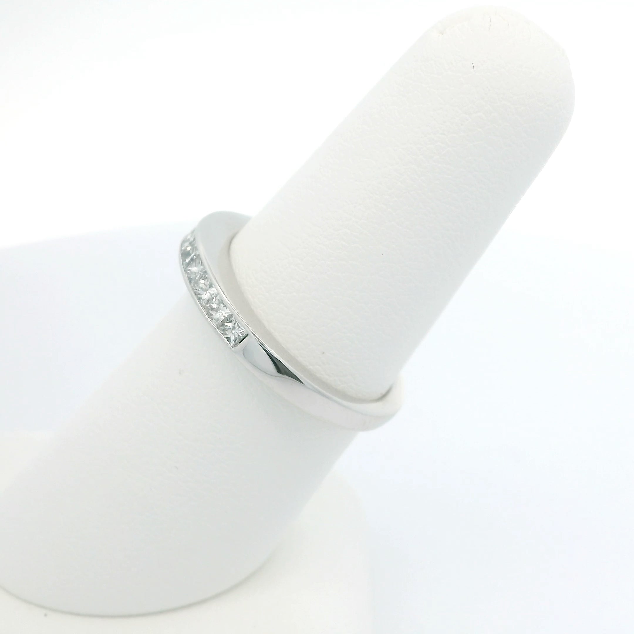 This platinum band showcases 11 princess cut diamonds with a total weight of 0.75 carats and a G/H color grade. Crafted to fit finger size 7, it combines sleek design with classic elegance, making it an ideal choice for both everyday wear and special occasions. The high-quality materials ensure lasting brilliance and comfort.