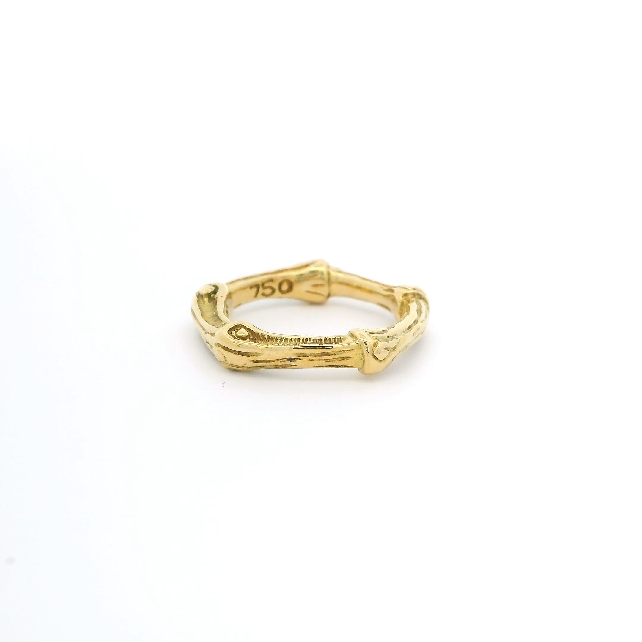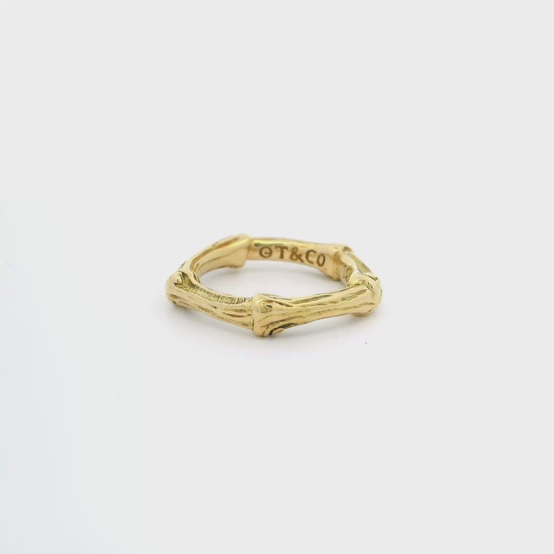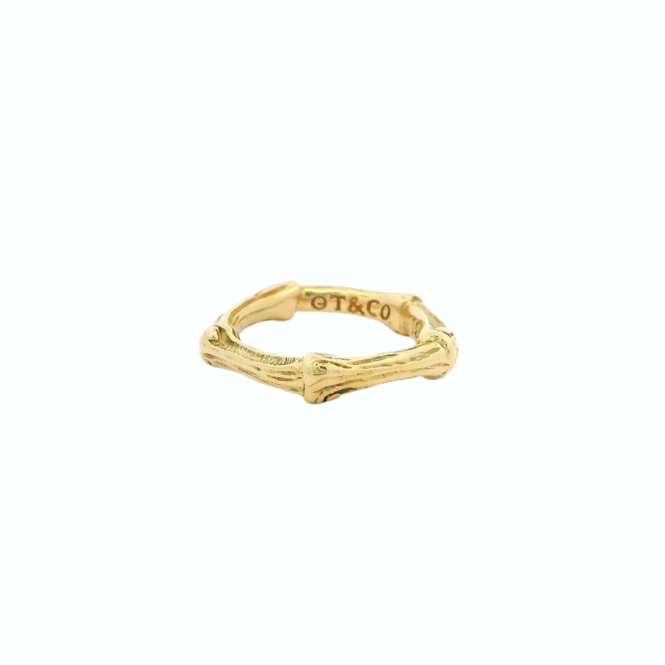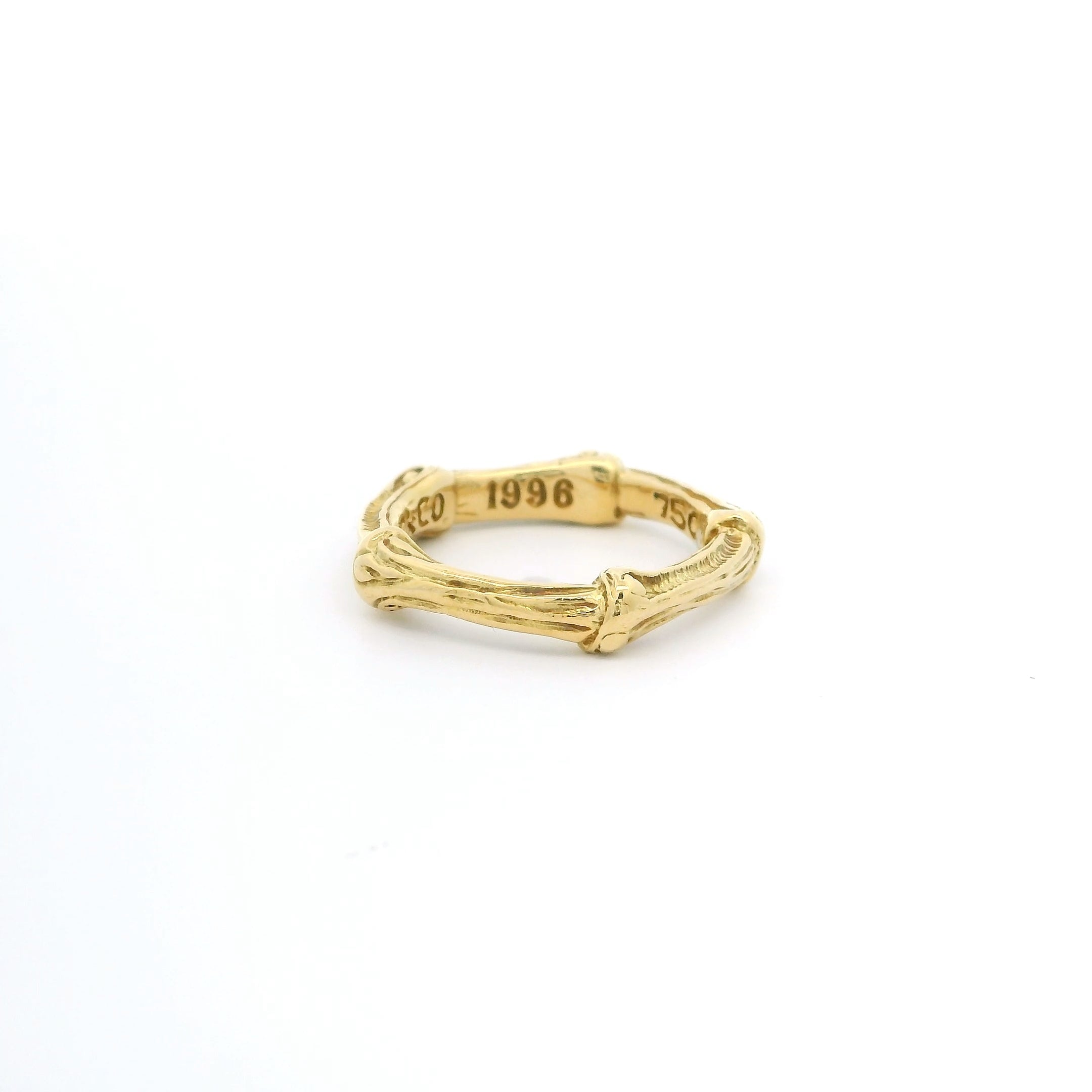 Crafted from 18k yellow gold, this Tiffany & Co. Bamboo Ring features a distinctive 4mm wide band inspired by natural bamboo. Weighing 5.6 grams and available in size 5, it combines elegant design with lasting quality, making it a refined choice for everyday wear or special occasions.