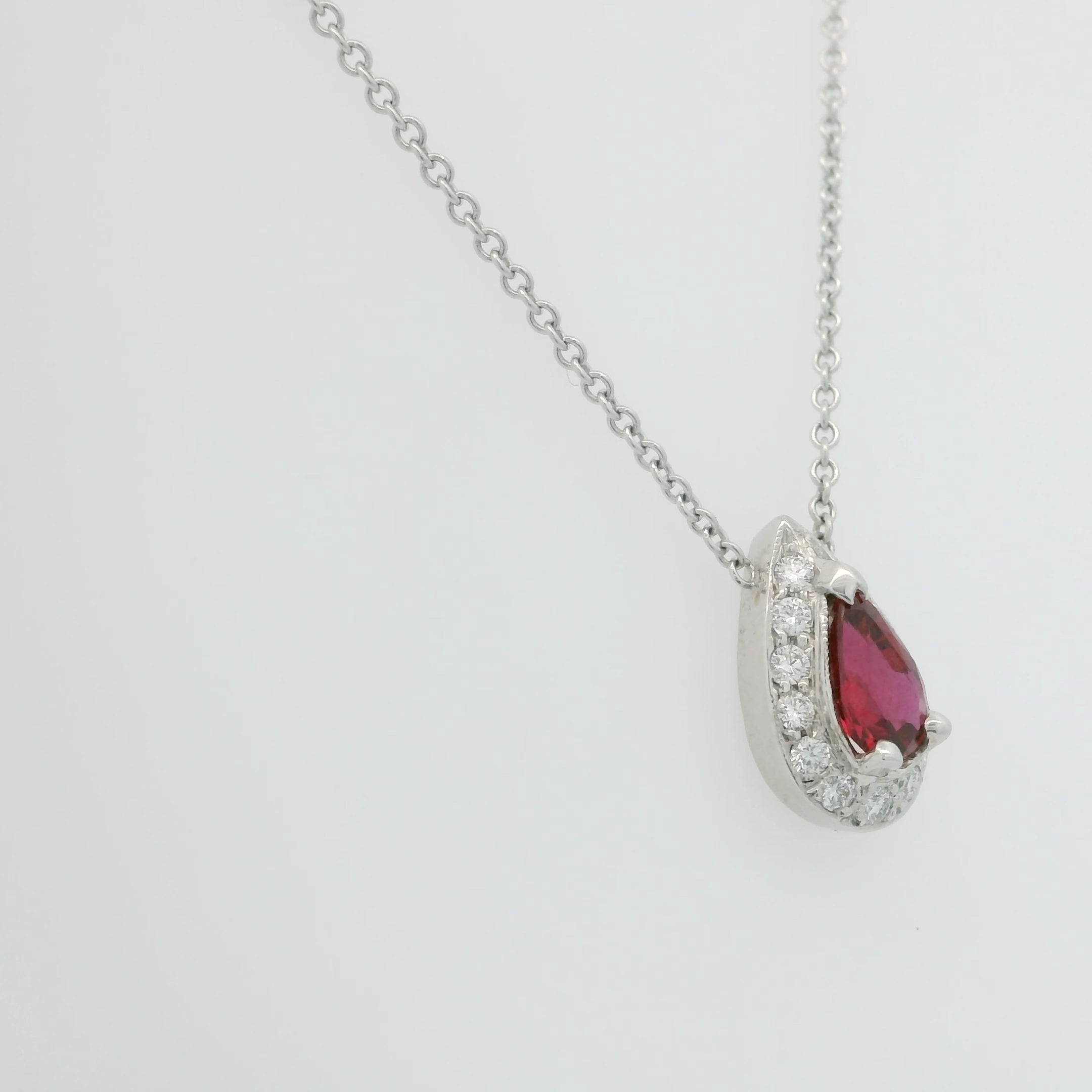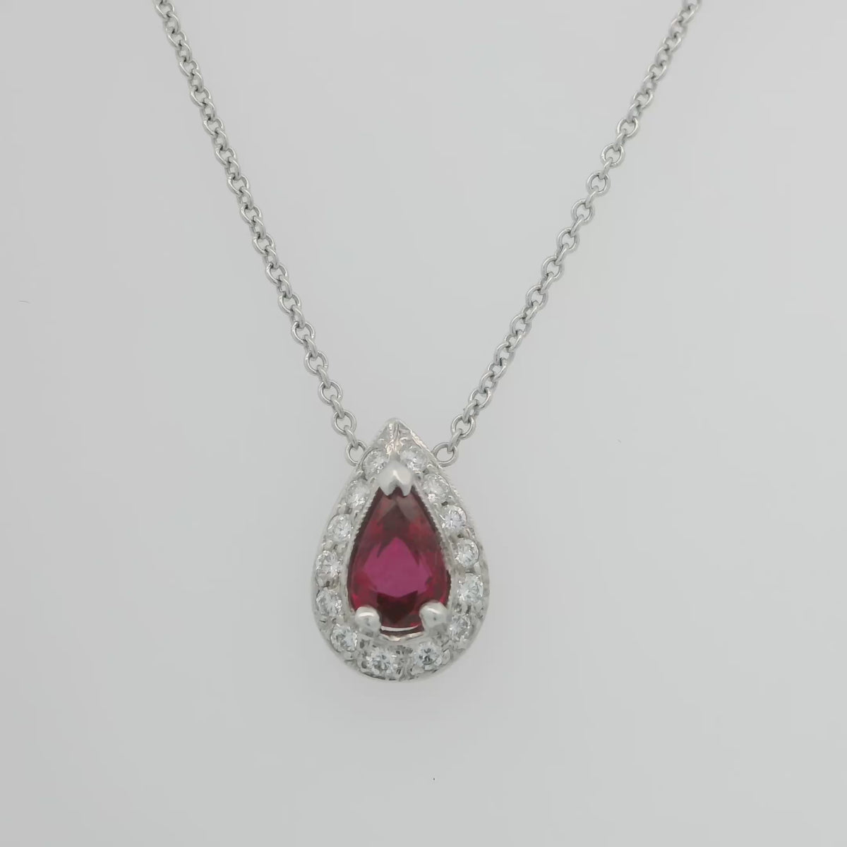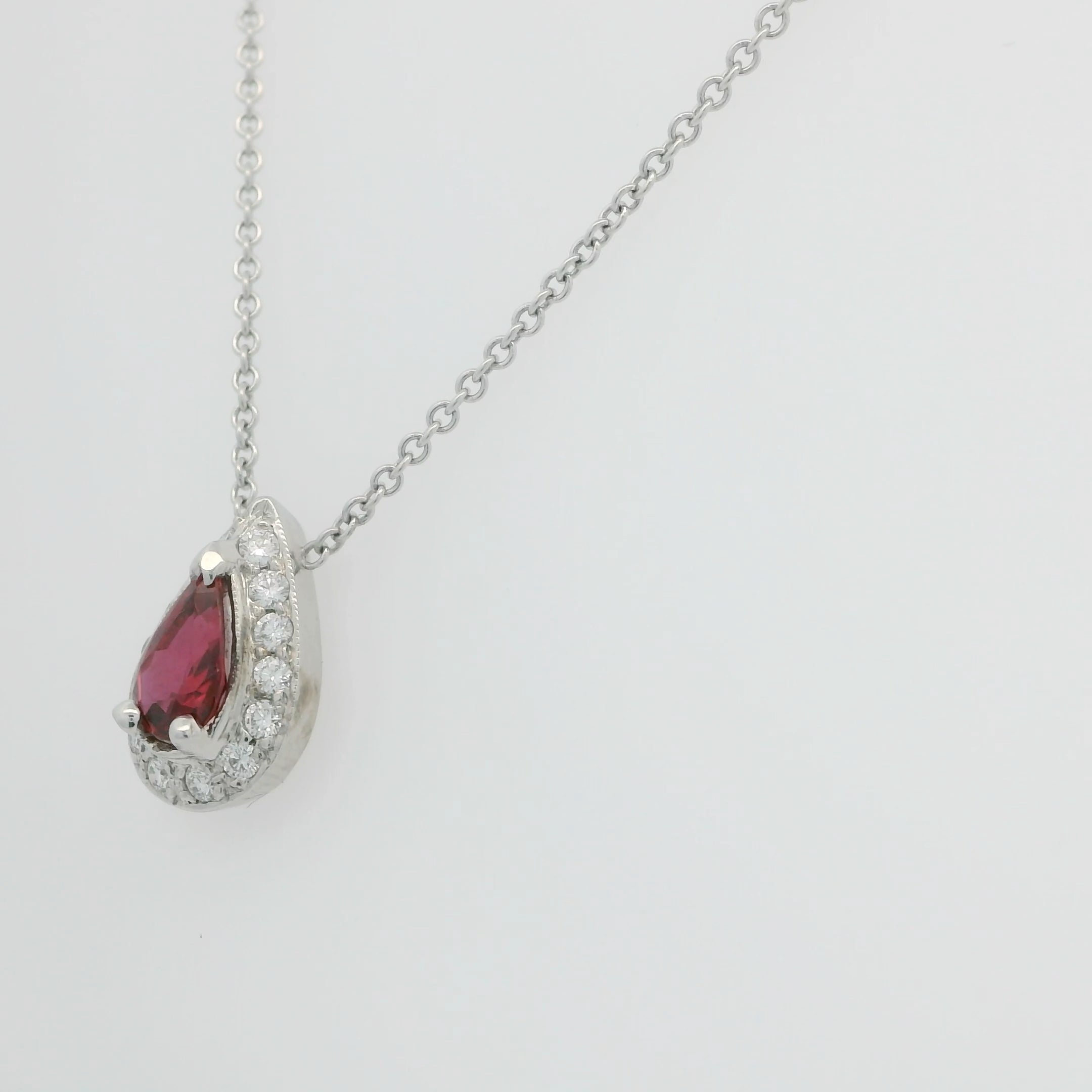 Crafted with precision and care, this exquisite Pear Shape Ruby Necklace is adorned with a sparkling diamond halo. It elegantly rests on a timeless cable chain, measuring 18 inches in length and adjustable to 16 inches. The beautiful ruby gemstone boasts a carat weight of 0.72, while the accompanying diamonds have a combined weight of 0.21 carats. Set in 18k white gold, this necklace exudes sophistication and luxury.