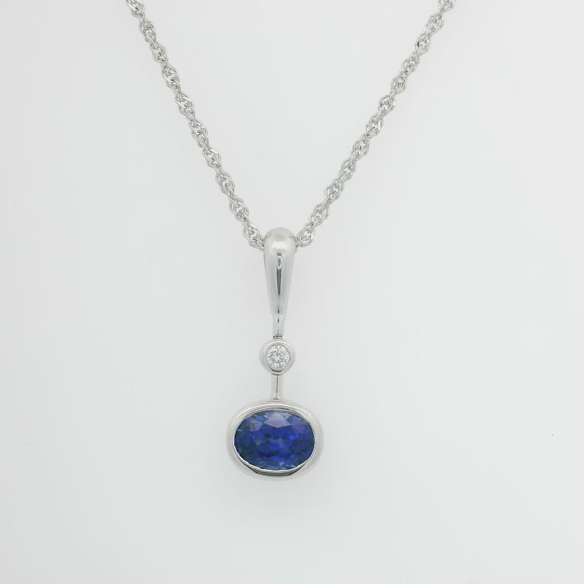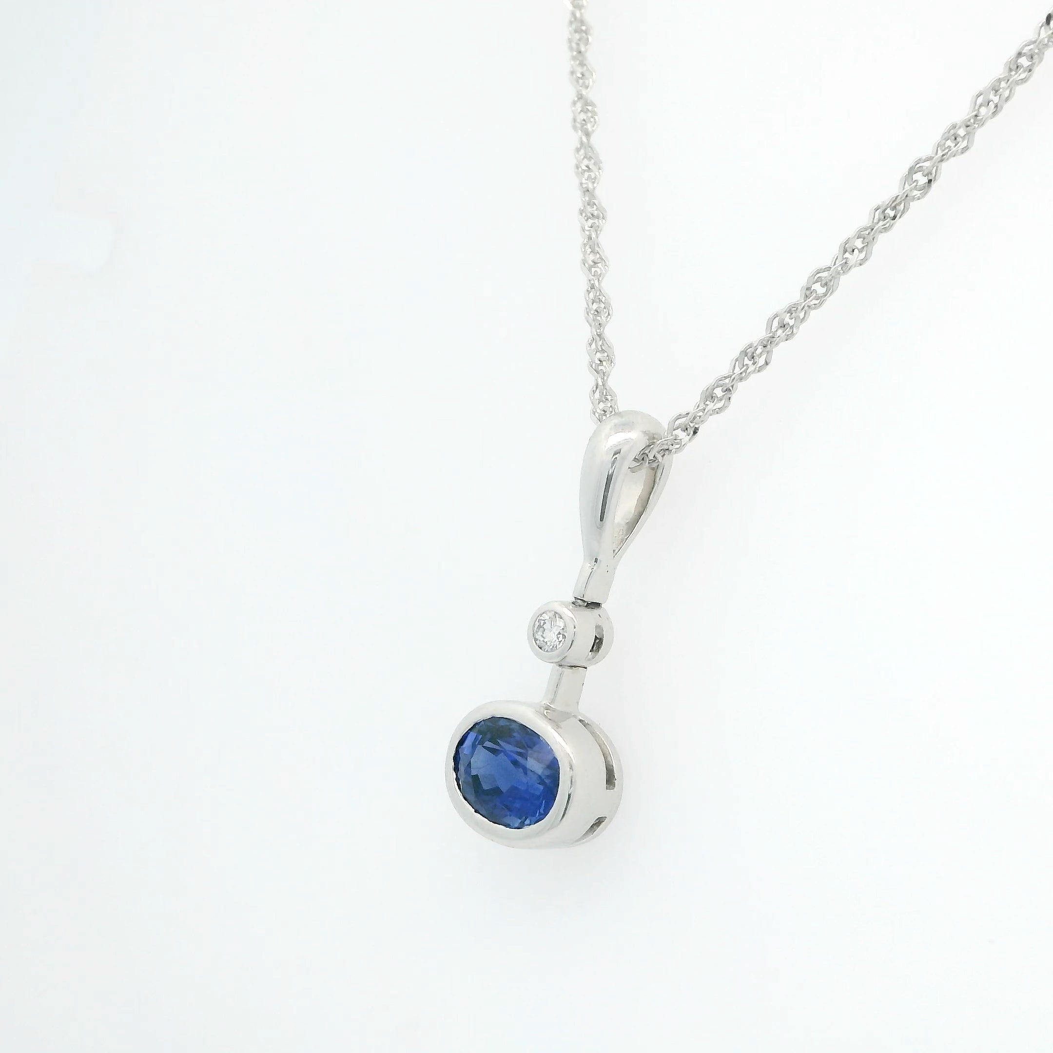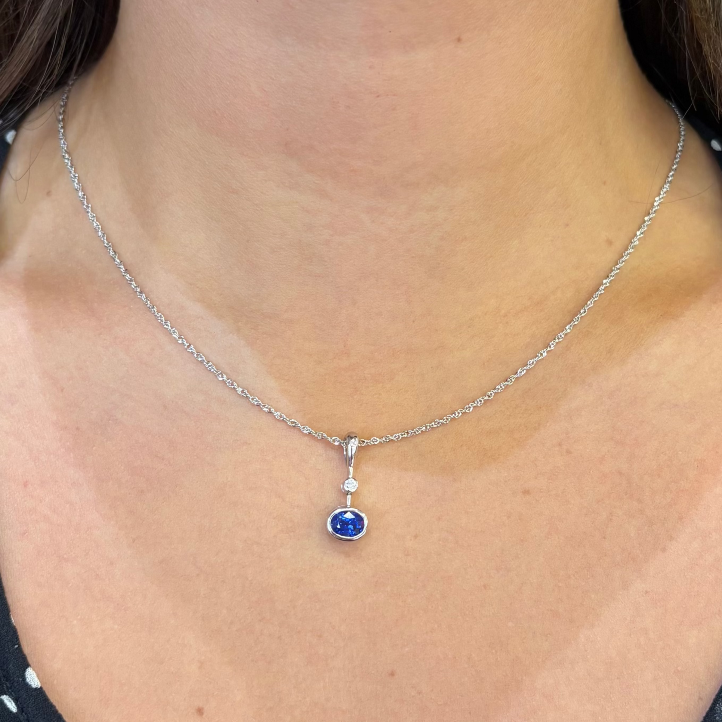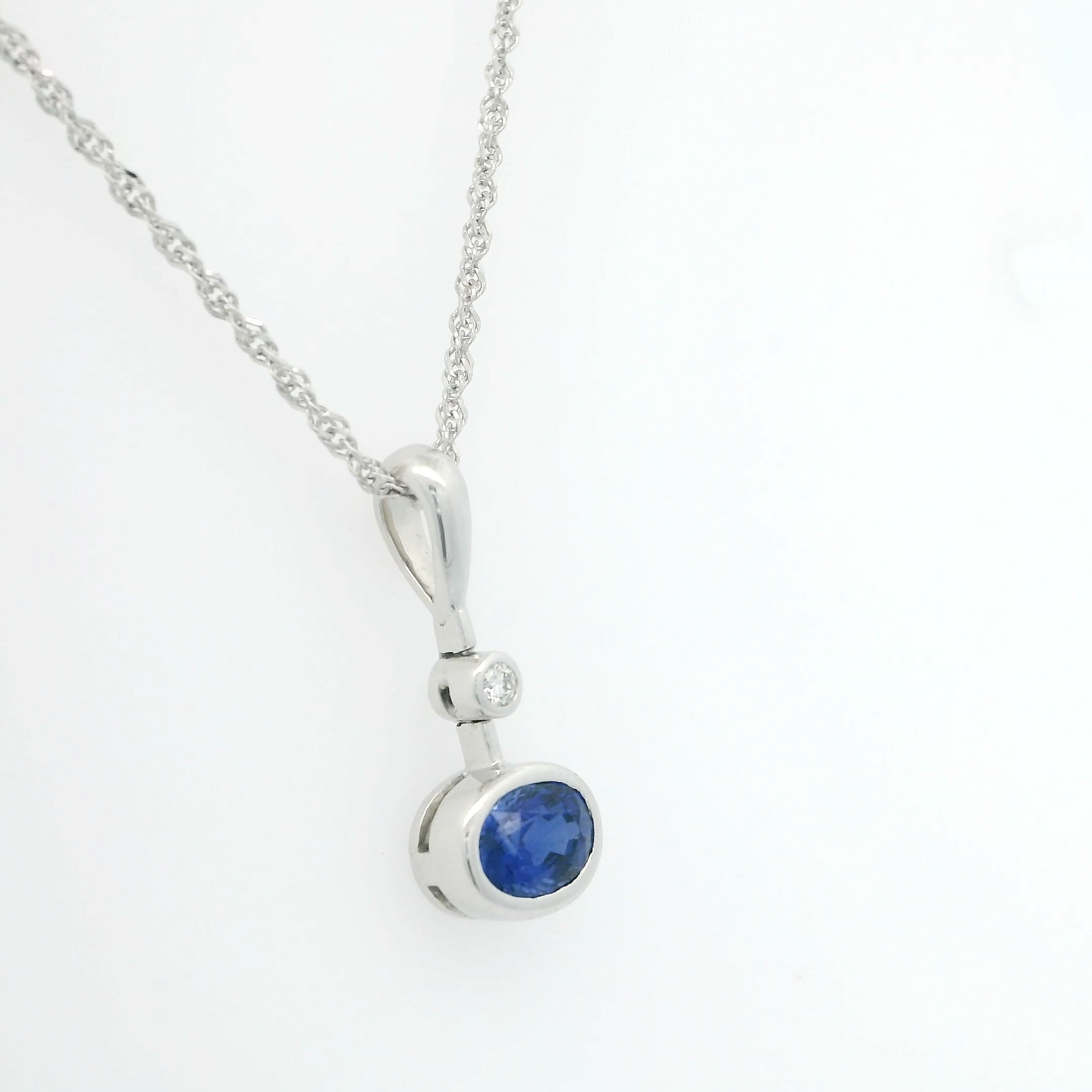 This elegant necklace features a 1.09-carat sapphire drop pendant set in 14k white gold, enhanced by bezel-set diamond accents totaling 0.30 carats. Its refined design combines timeless sophistication with subtle sparkle, making it an ideal choice for both everyday wear and special occasions.
