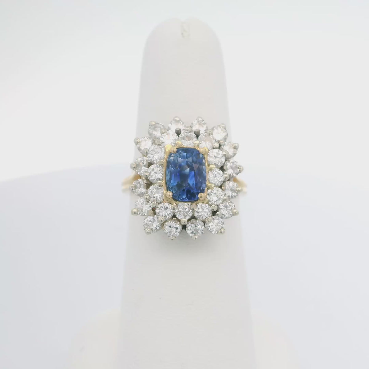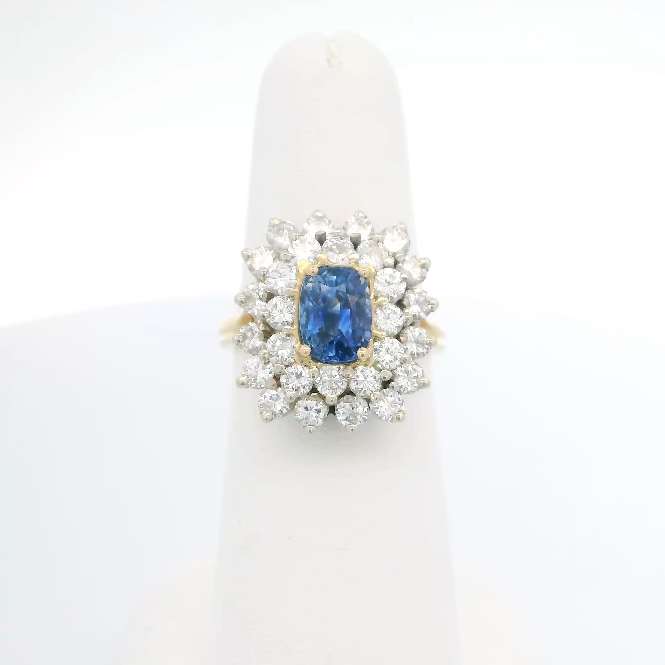 This elegant 14 karat two-tone ring features a stunning 0.92 carat sapphire centerpiece surrounded by a double halo of diamonds totaling 1.35 carats. The combination of rich sapphire color and sparkling diamonds creates a sophisticated and timeless design, perfect for special occasions or everyday elegance.