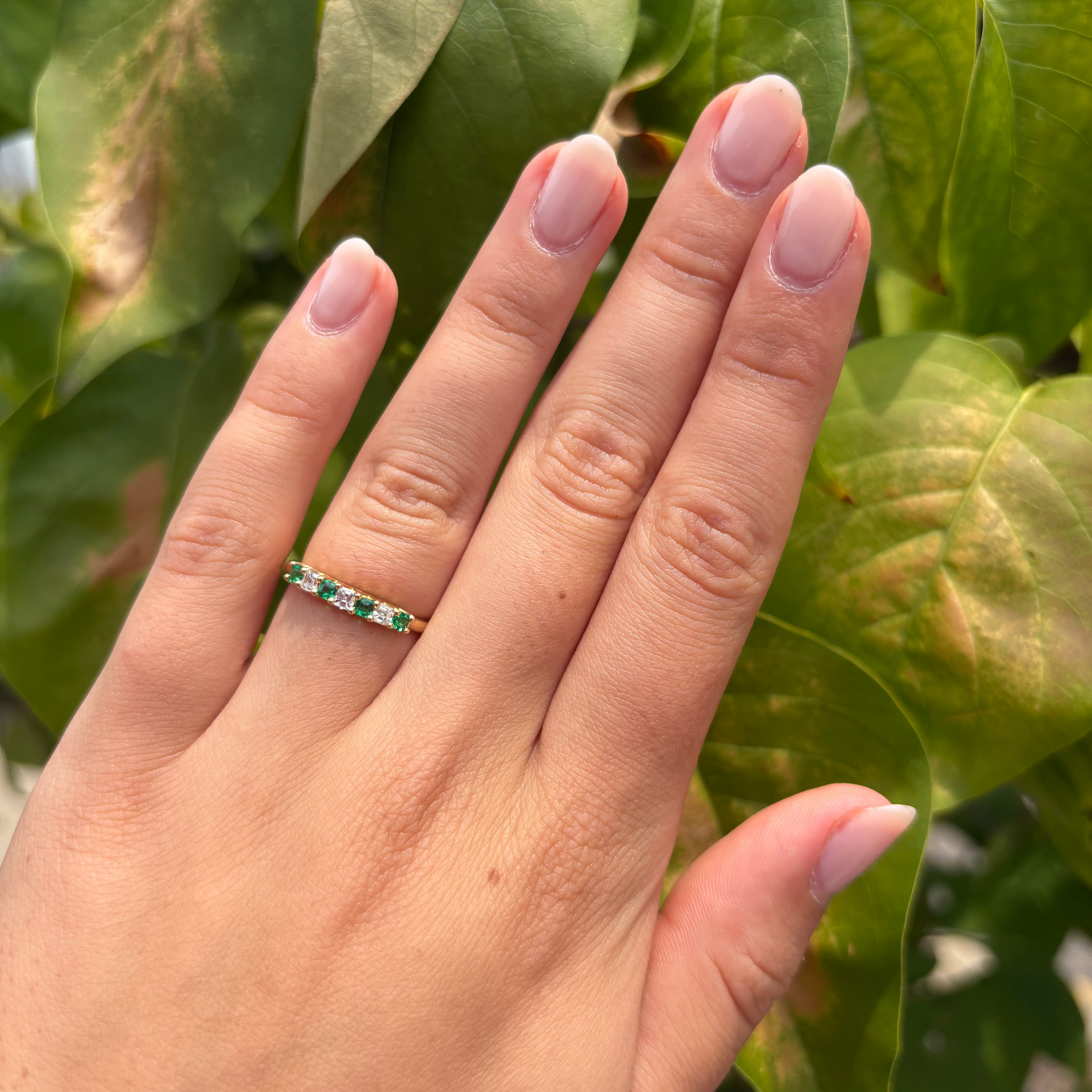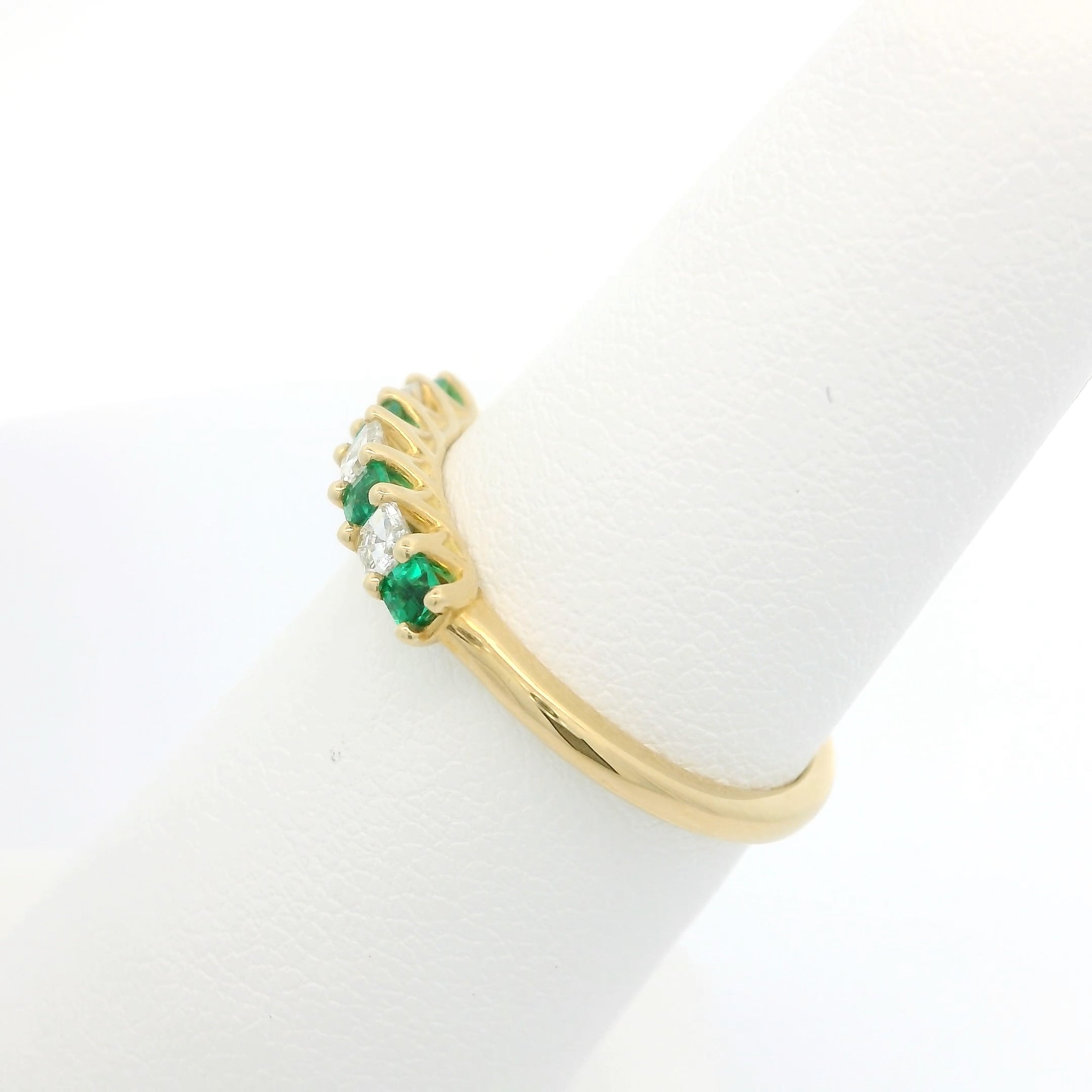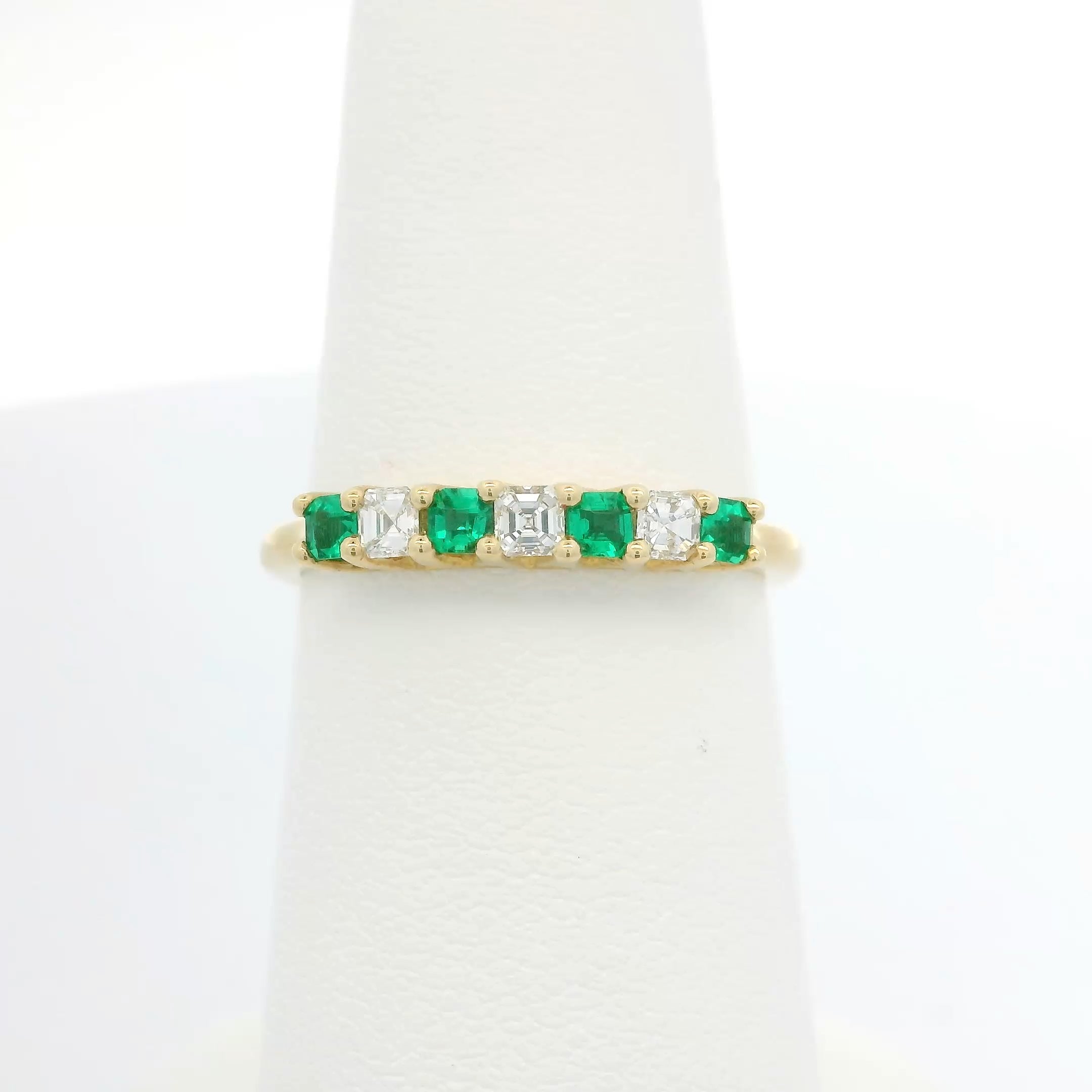 This refined band is crafted from 18k yellow gold and features prong-set Asscher cut stones, including 0.17 carats of emeralds and 0.18 carats of diamonds with F color and VS1 clarity. The combination of the emeralds’ rich green tones and the diamonds’ exceptional brilliance creates a timeless and elegant piece suitable for any sophisticated collection.