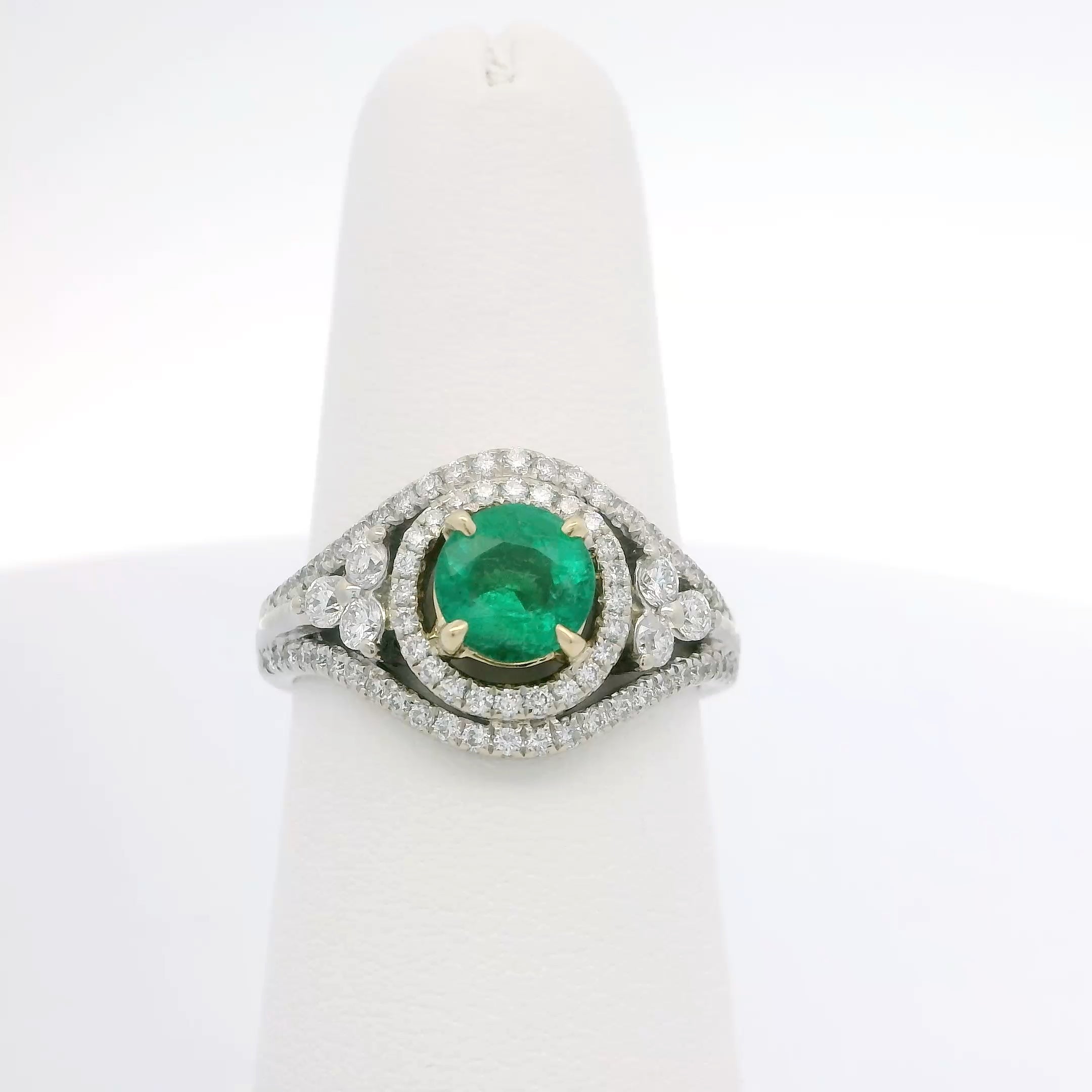 This elegant two-tone ring features a 0.71-carat emerald set in rich yellow gold, complemented by 0.65 carats of diamond accents beautifully set in white gold. Crafted in 18 karat, the contrasting metals enhance the vibrant green of the emerald and the sparkle of the diamonds, creating a refined and timeless piece perfect for any occasion.