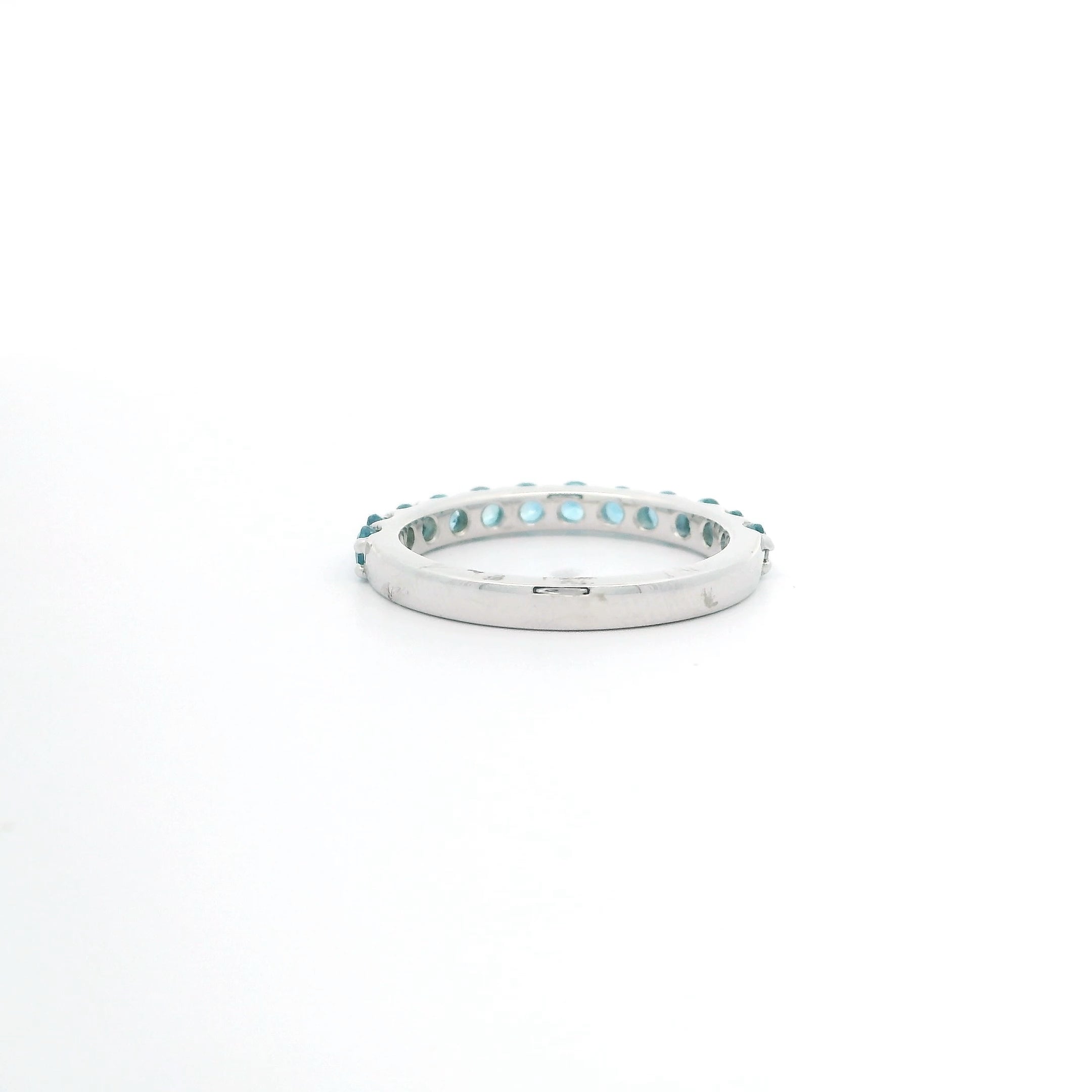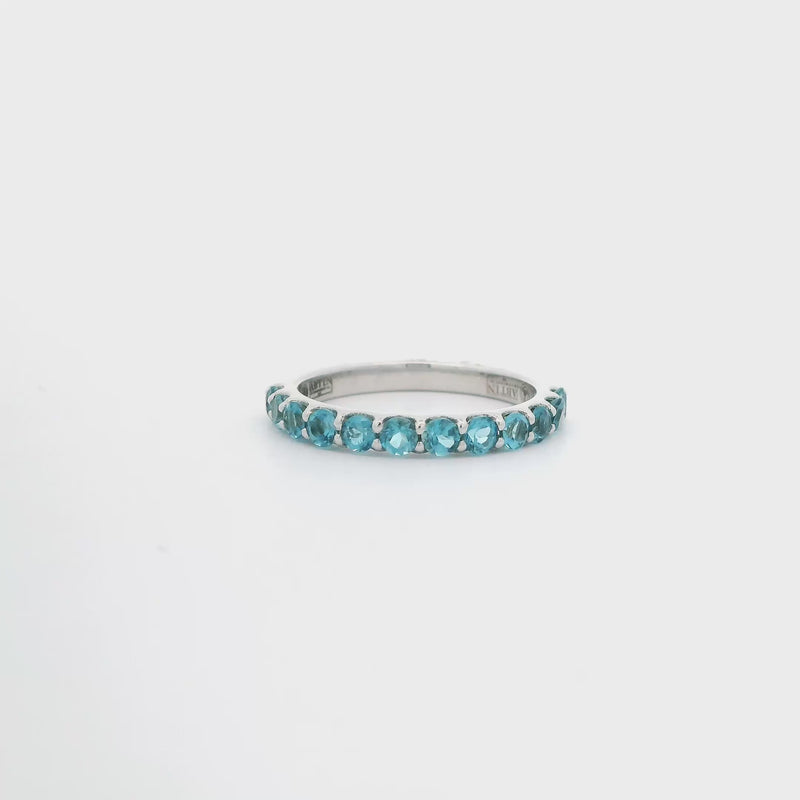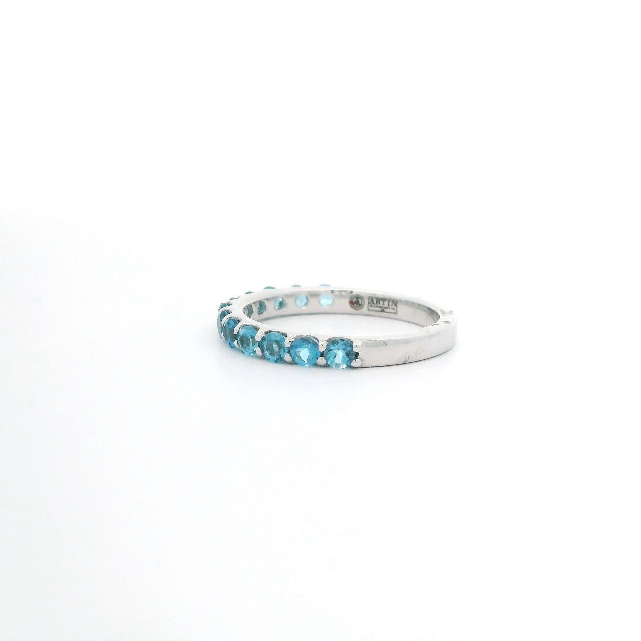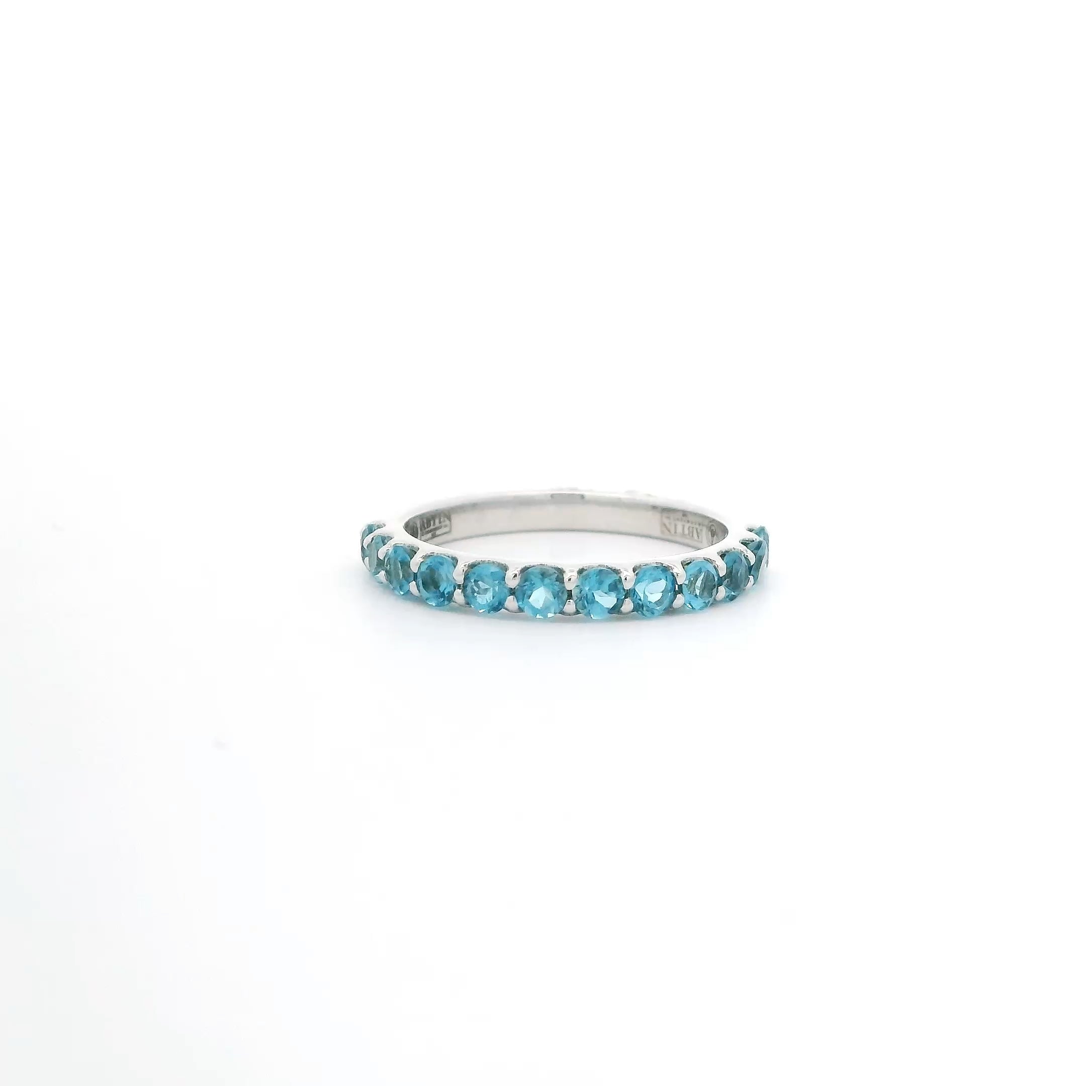 This elegant Blue Topaz Band features 14k white gold and showcases twelve blue topaz stones totaling 0.94 carats. The shared prong setting enhances the sparkle of each gemstone, creating a refined and timeless piece suitable for any occasion.
