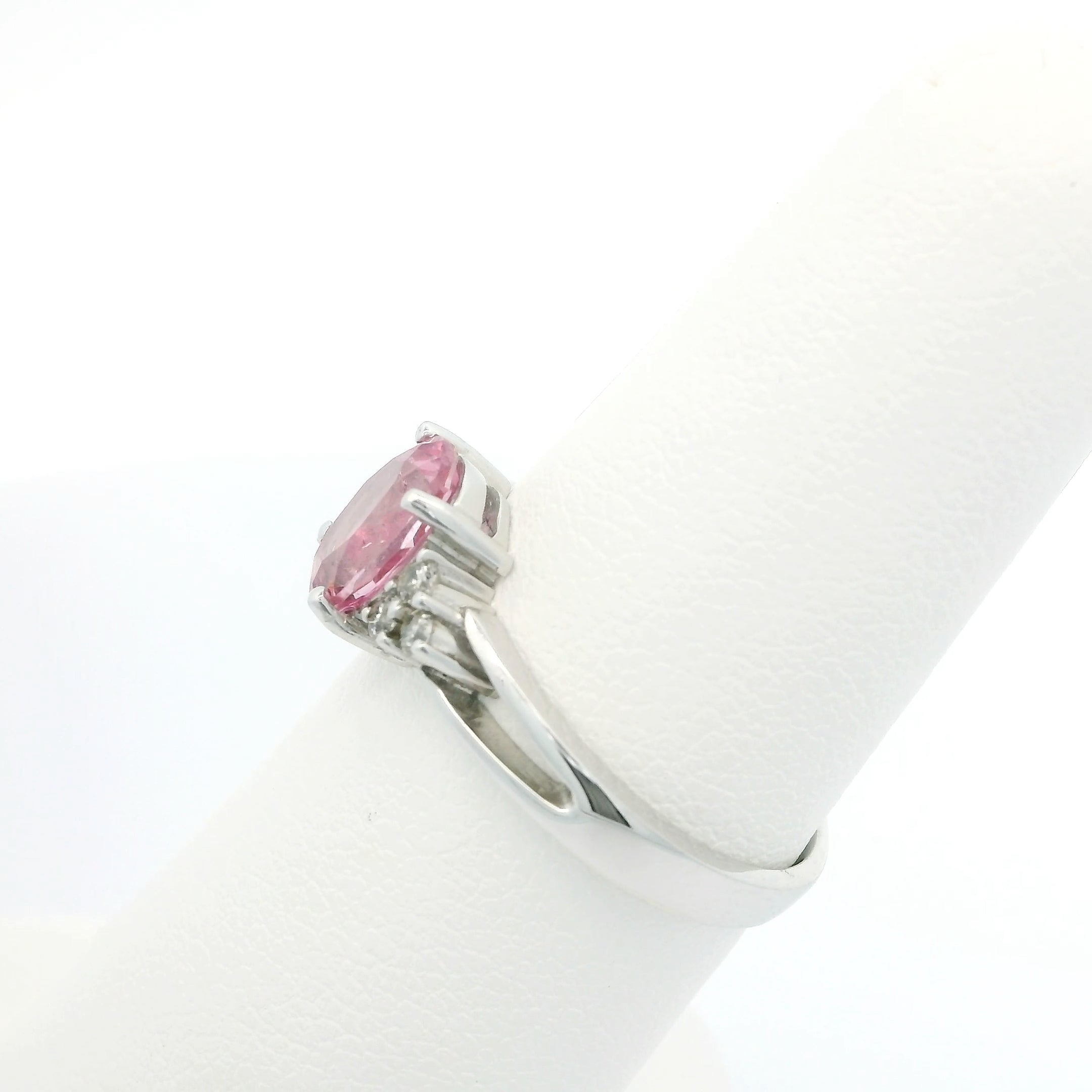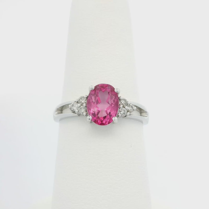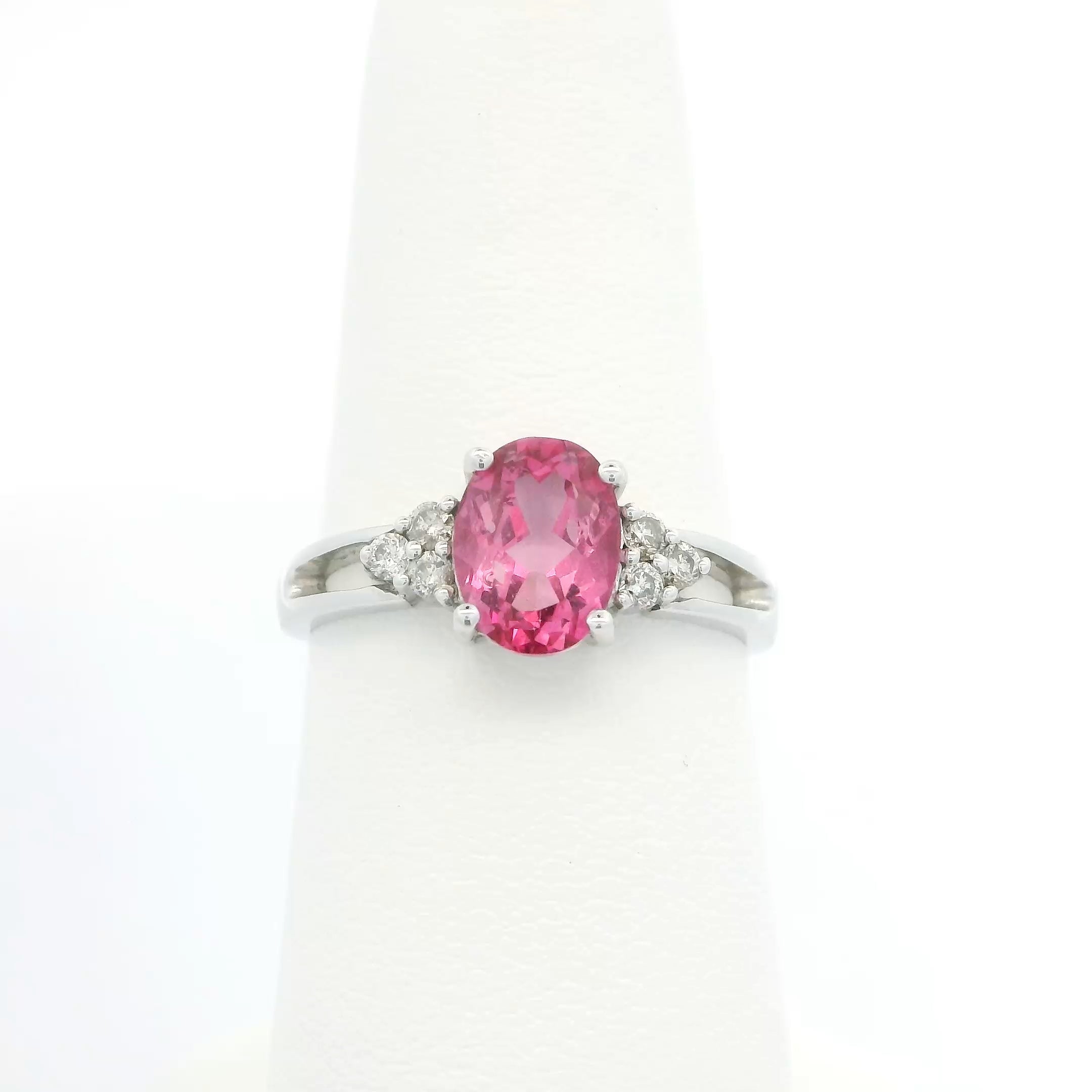 This elegant ring features a 1.30-carat pink topaz set in 14k white gold, complemented by 0.15 carats of diamond accents. The combination highlights the vibrant center stone while adding subtle sparkle, making it a refined choice for sophisticated style.