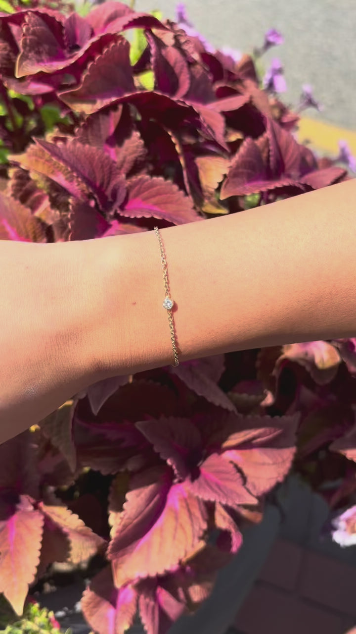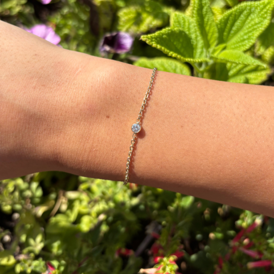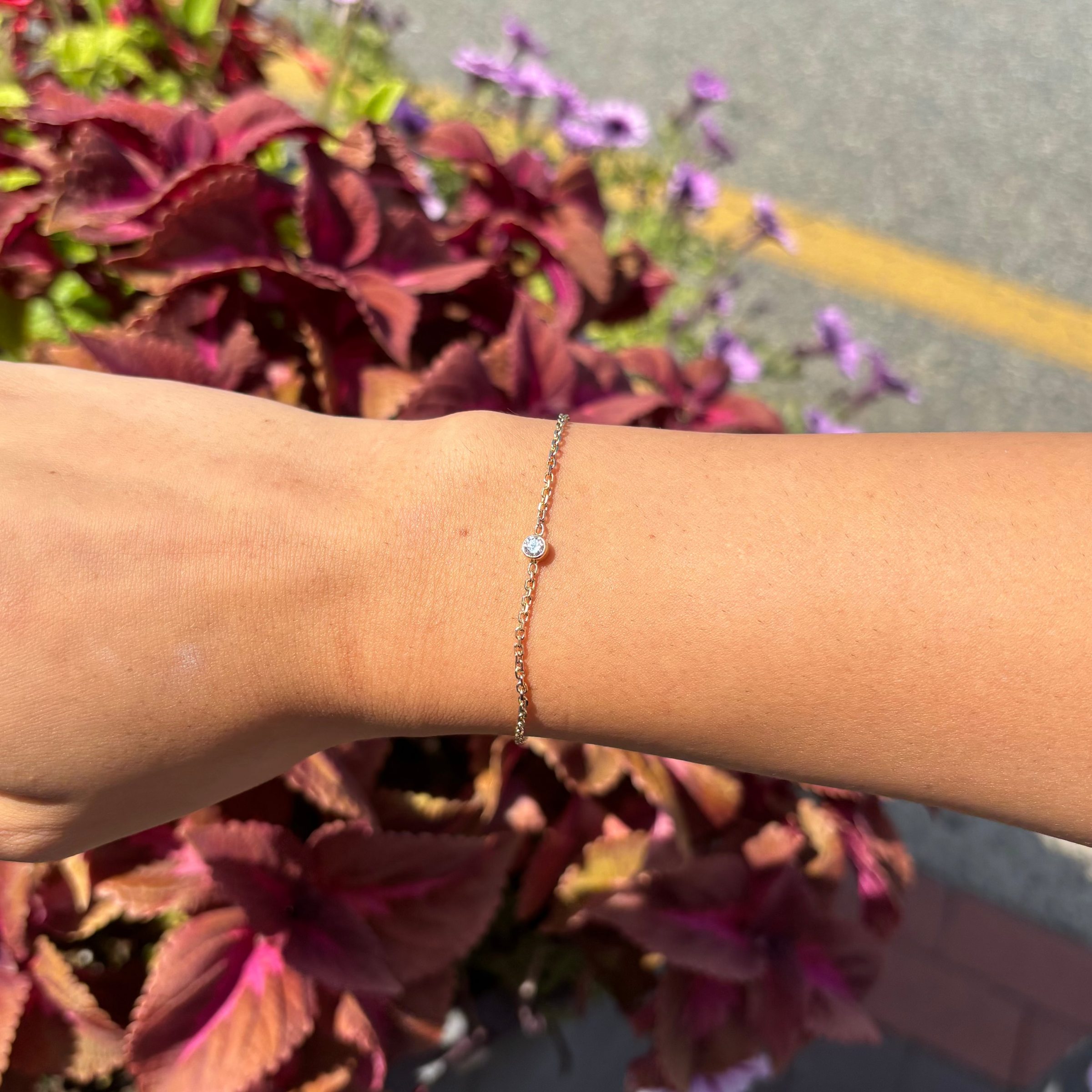 This elegant Single Diamond Bracelet features a delicate 1.5mm wide 14k yellow gold cable link chain, showcasing a bezel-set diamond totaling 0.16 carats. Its refined design offers a subtle yet sophisticated sparkle, perfect for everyday wear or special occasions.