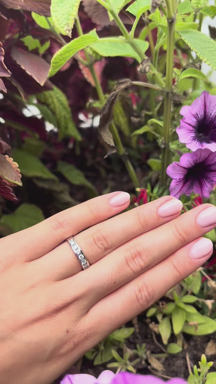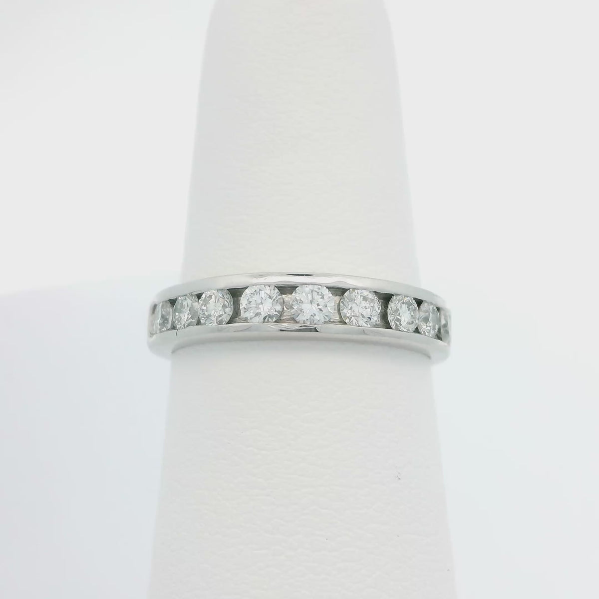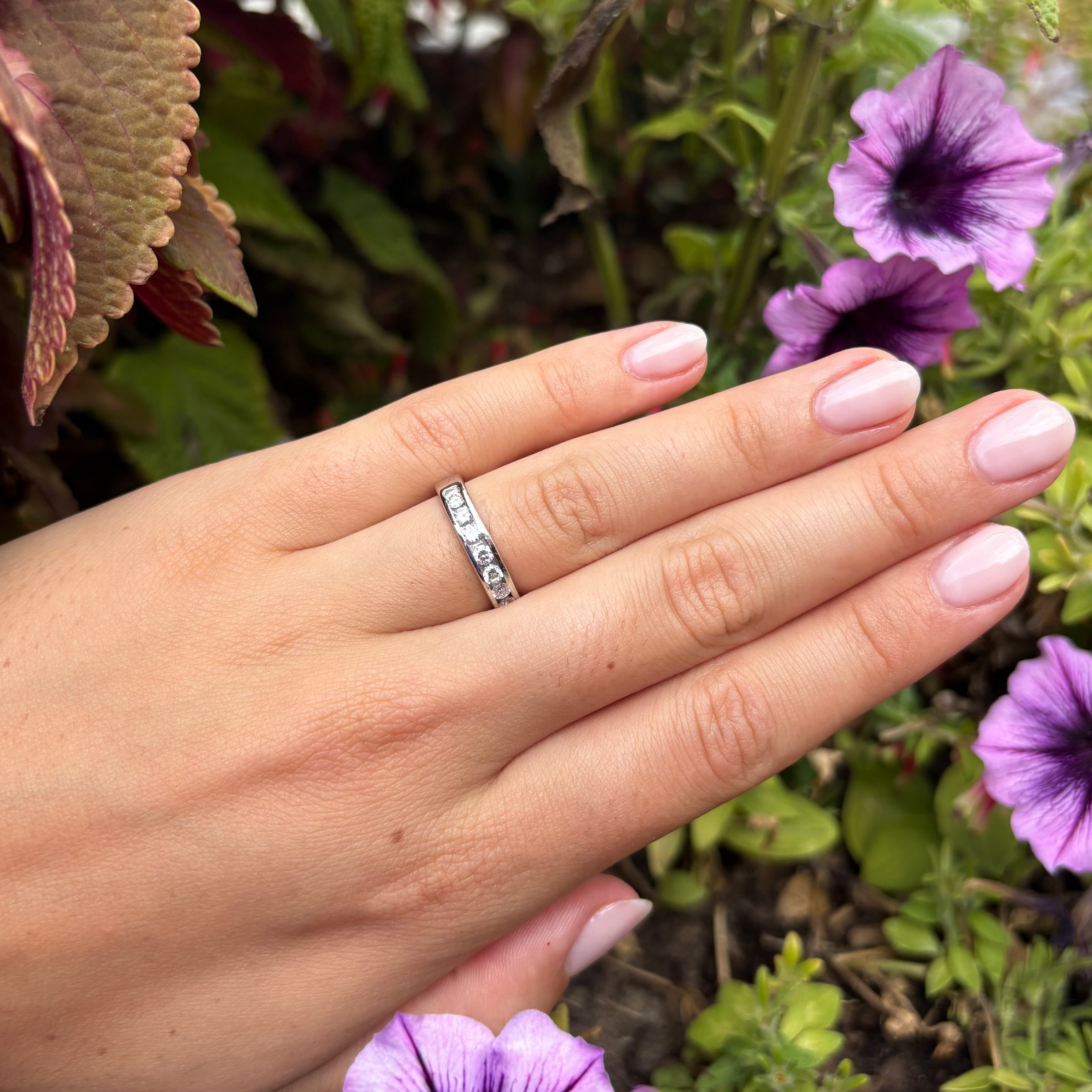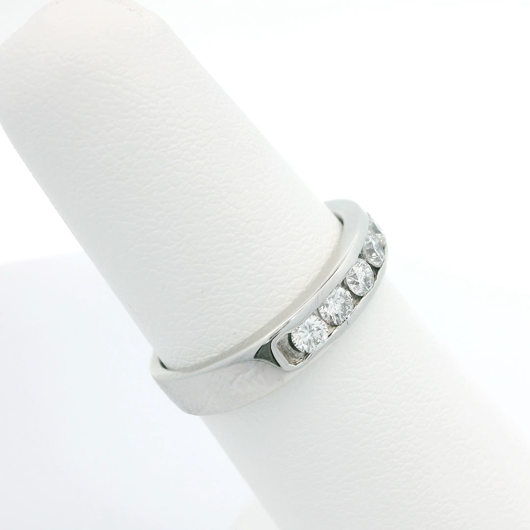 This 14k white gold diamond band features a sleek channel setting with nine diamonds totaling 0.50 carats. Its refined design offers enduring sparkle and comfort, making it an elegant choice for everyday wear or special occasions.