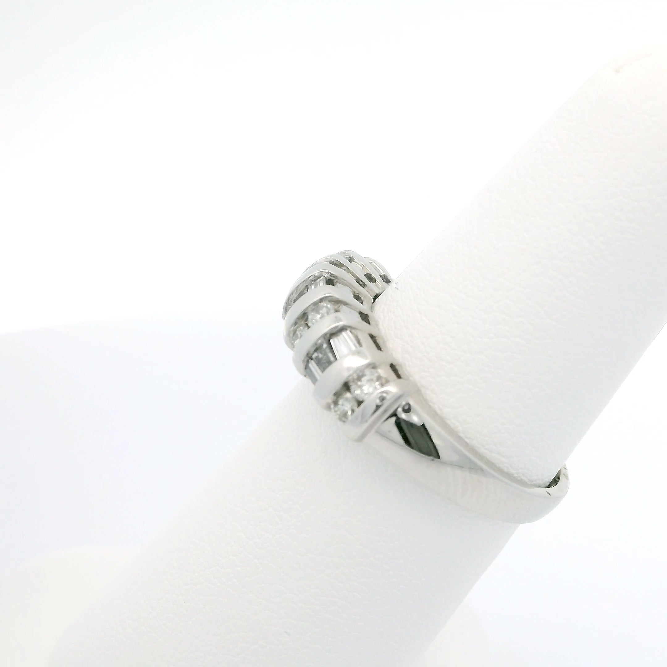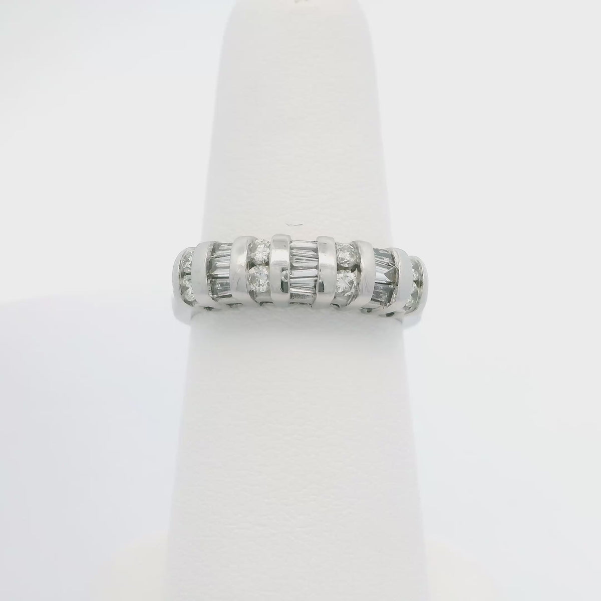 This elegant Diamond Band is crafted from 14k white gold and features a stunning combination of round and baguette diamonds. With a total diamond weight of 0.70 carats, the stones boast G color and VS2 clarity, ensuring brilliant sparkle and exceptional quality. Perfect for adding timeless sophistication to any jewelry collection.