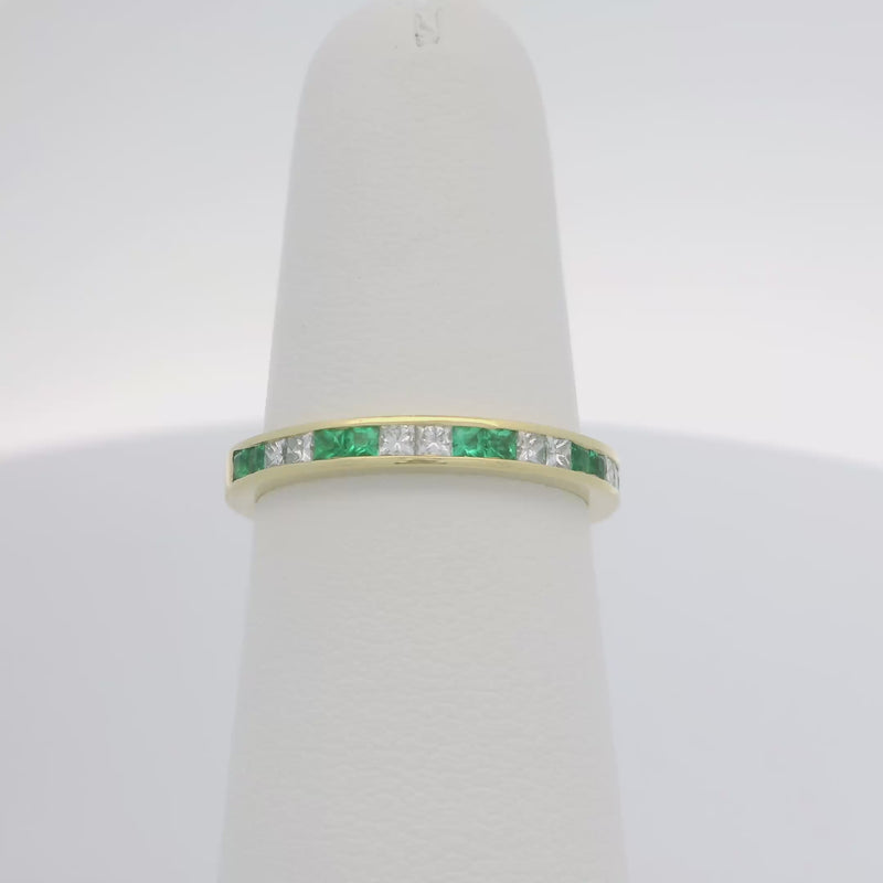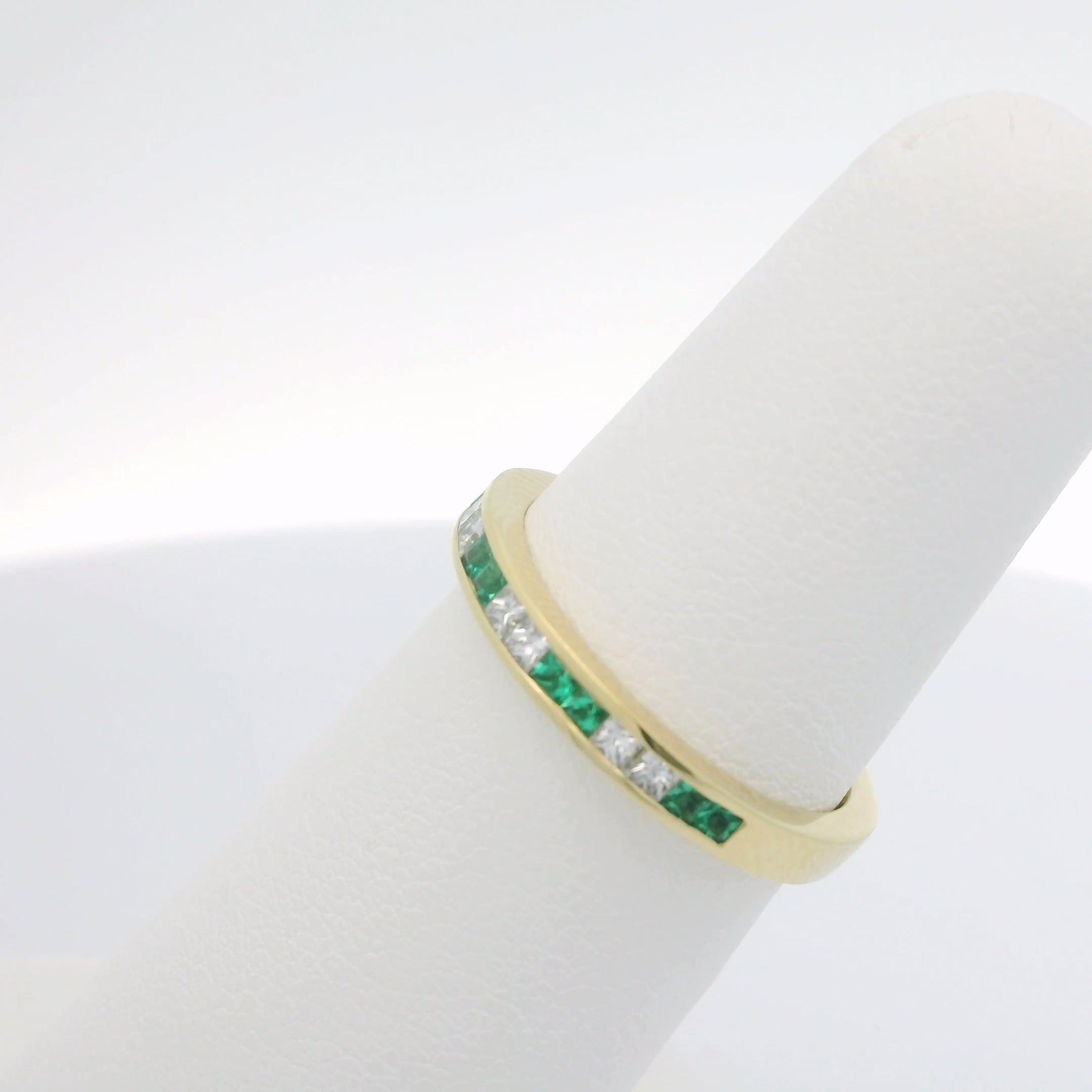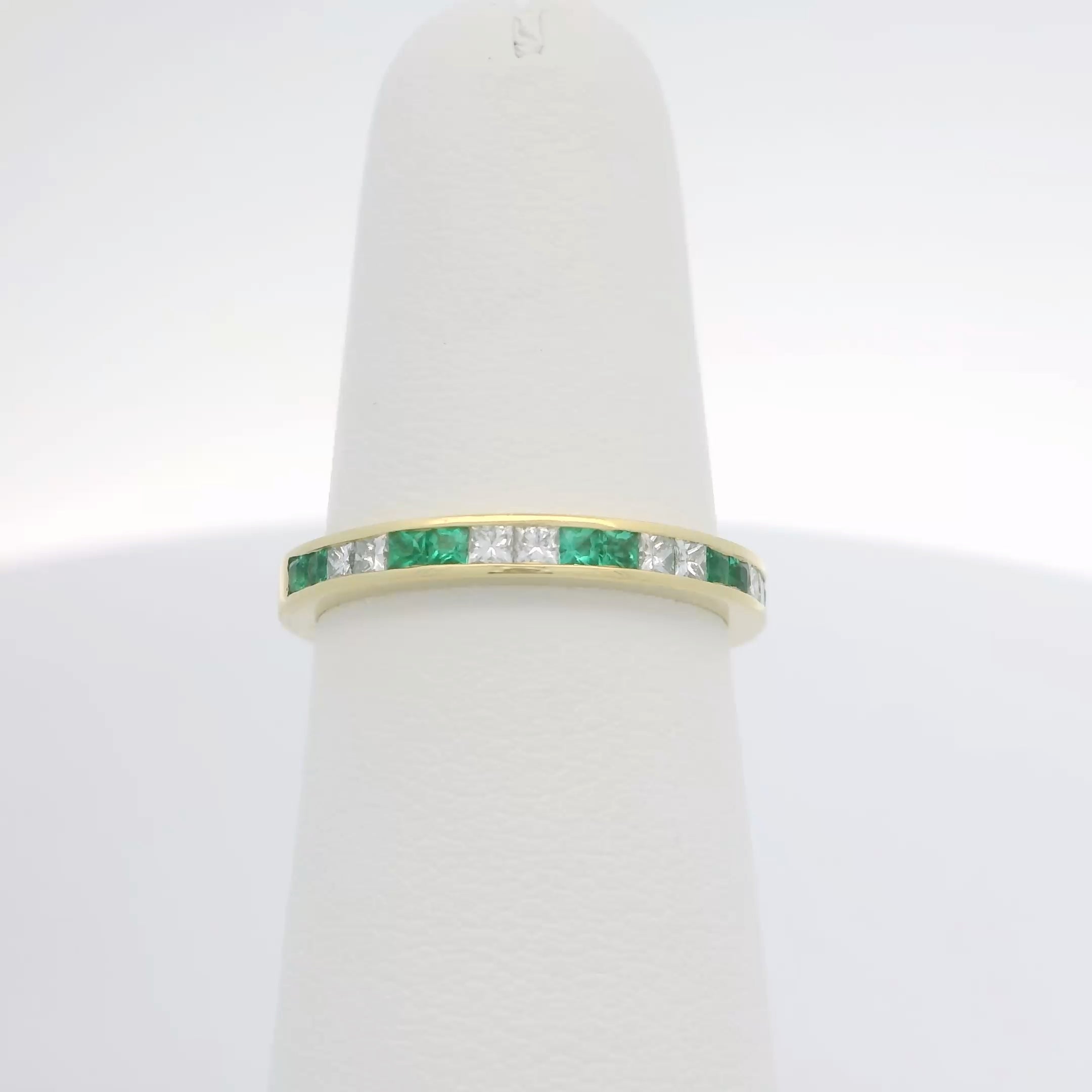This 18k yellow gold band showcases a refined channel setting, elegantly holding 0.19 carats of emeralds alongside 0.24 carats of princess-cut diamonds. The balanced design highlights the vivid green of the emeralds complemented by the sparkle of the diamonds, creating a timeless piece suitable for both daily wear and special occasions.