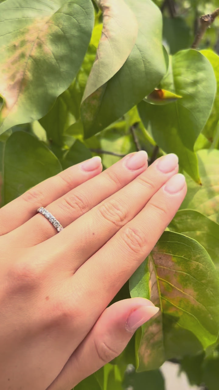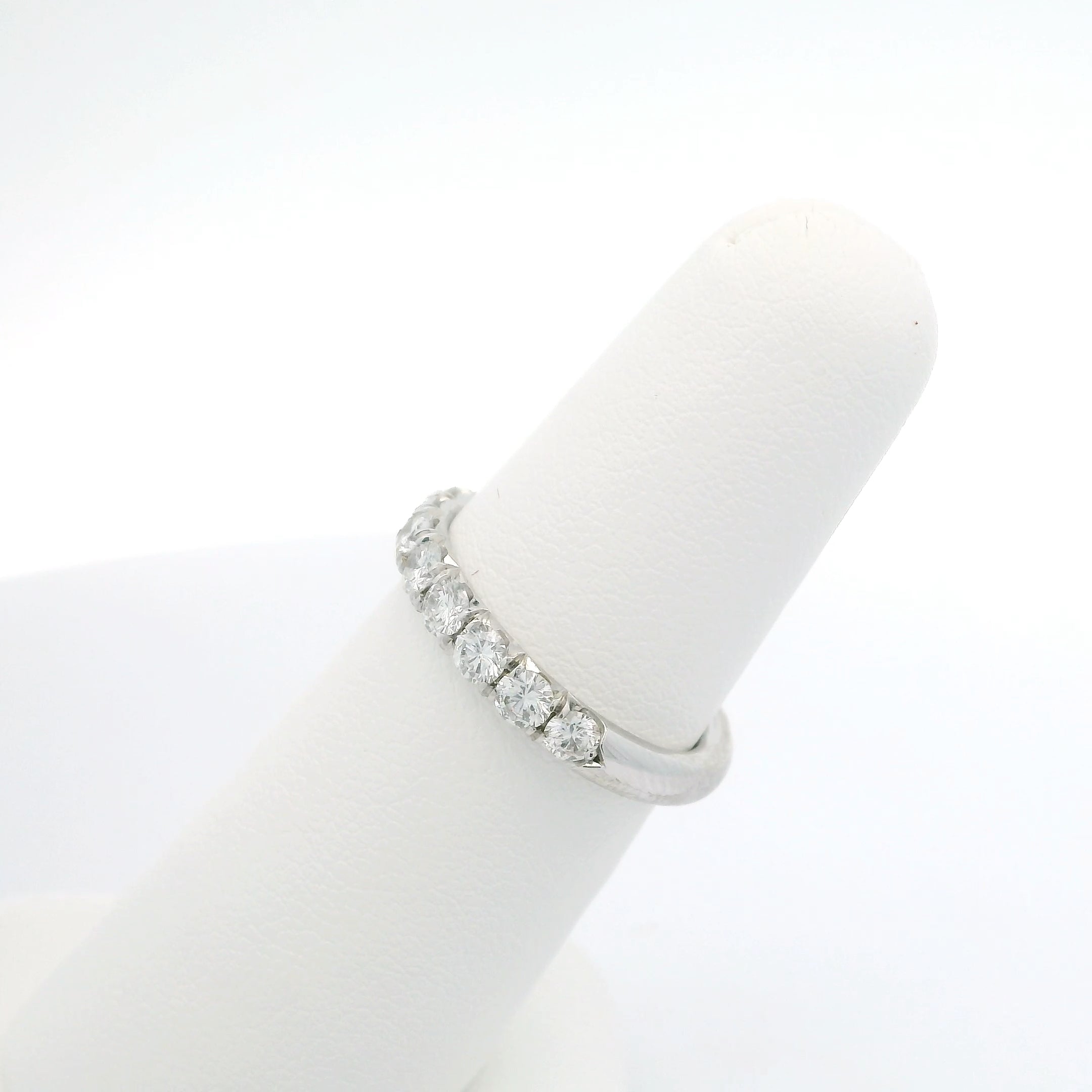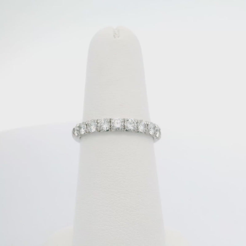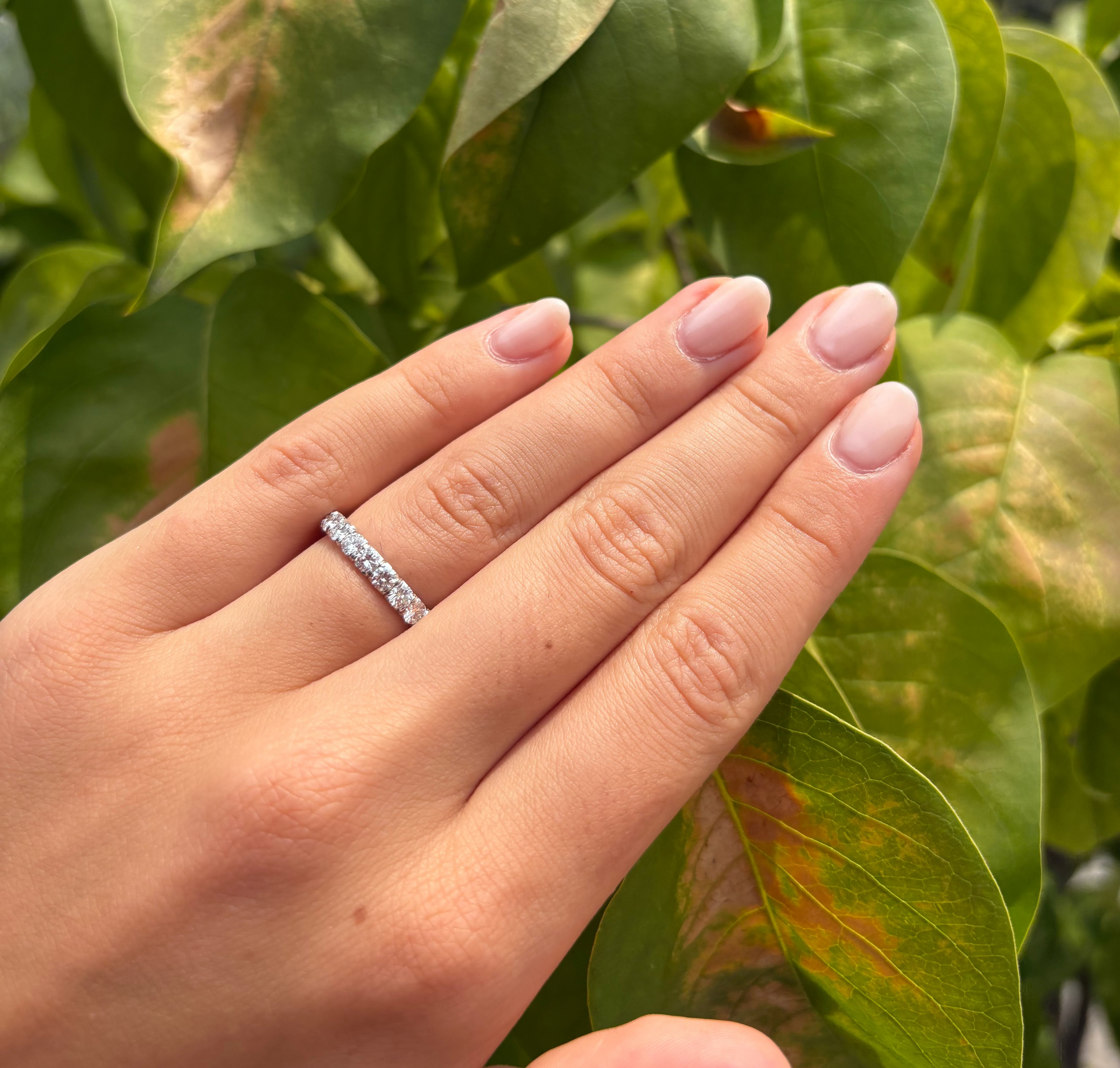 This 14k white gold band features 10 carefully set diamonds totaling 0.80 carats, with G color and VS2 clarity. The diamonds are securely set in a cut down style to protect each stone, making the ring durable for everyday wear. At 3mm wide, its sleek design pairs beautifully with other rings, making it an ideal choice for a wedding band.