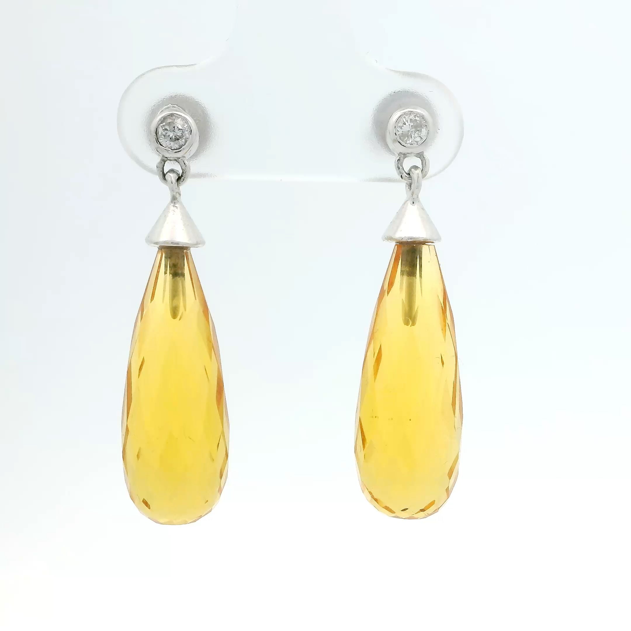 These Citrine Briolette Drop Earrings feature a total of 16.00 carats of vibrant citrines set in elegant 14k white gold. Accented with 0.11 carats of diamonds, they offer a refined sparkle that enhances the warm glow of the gemstones, making them perfect for both everyday wear and special occasions.