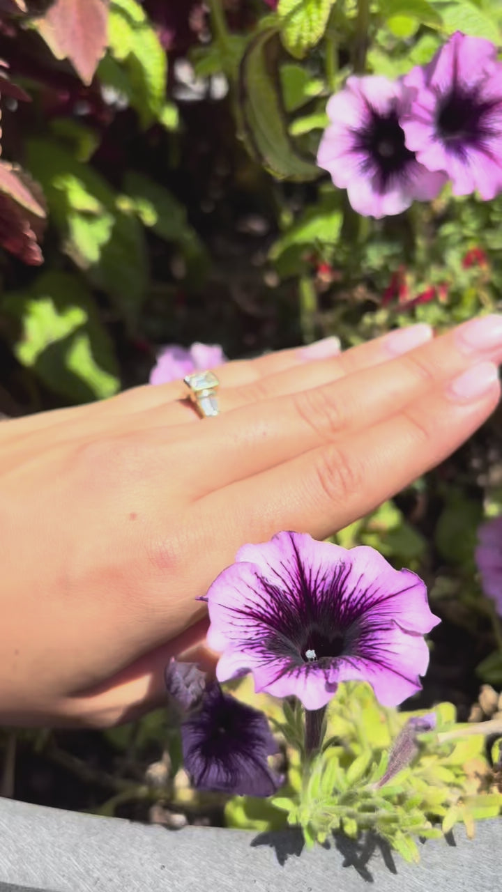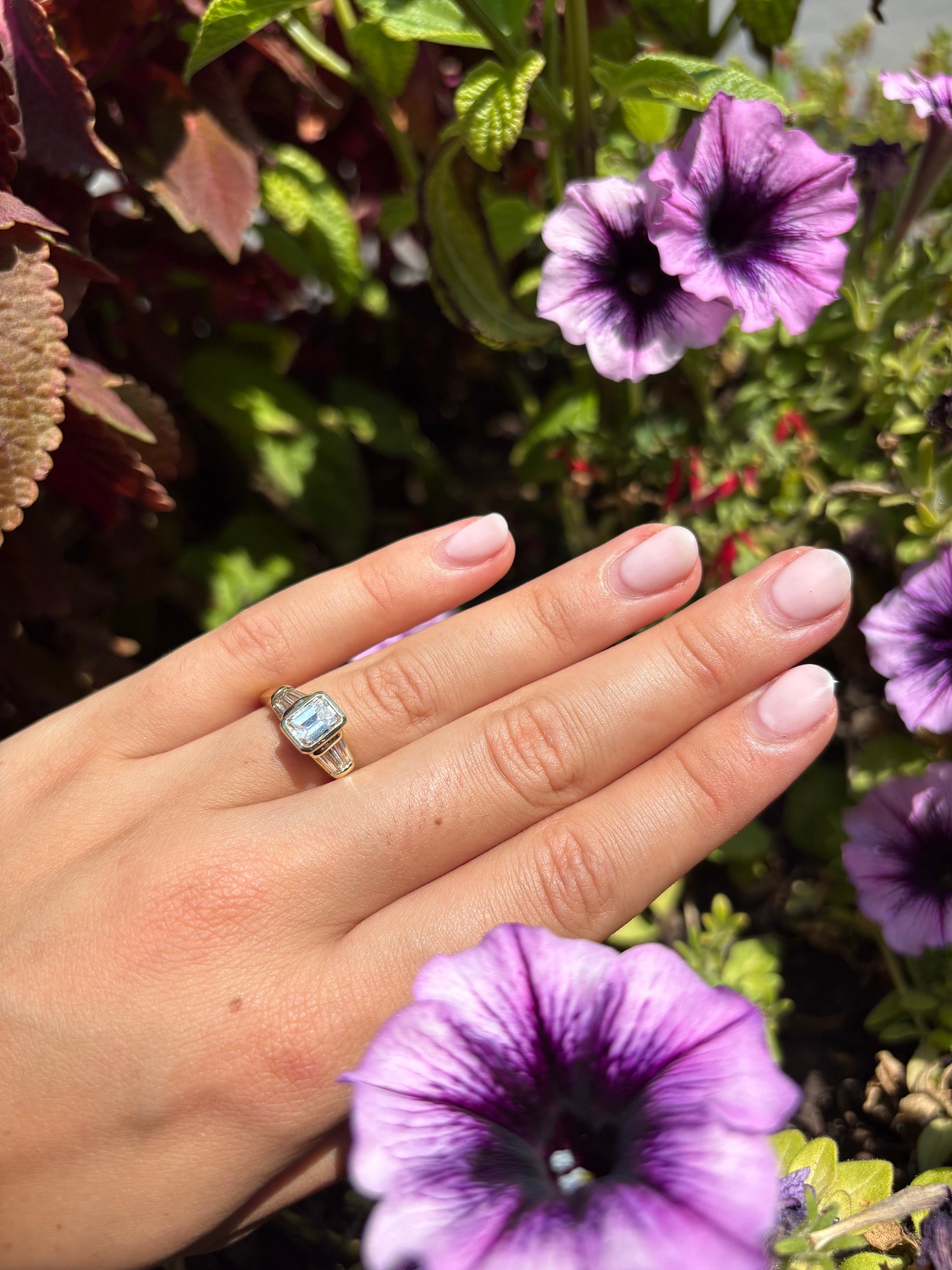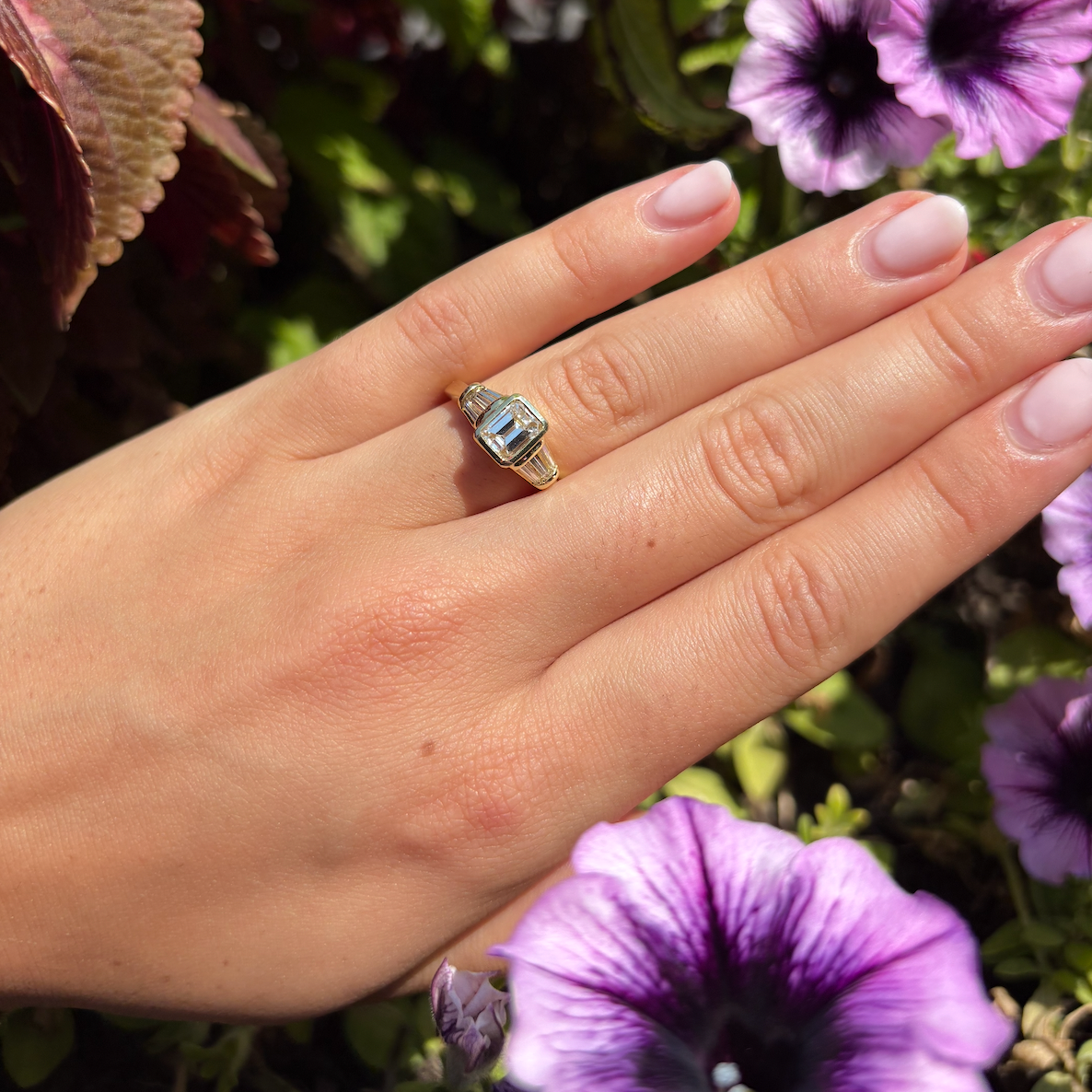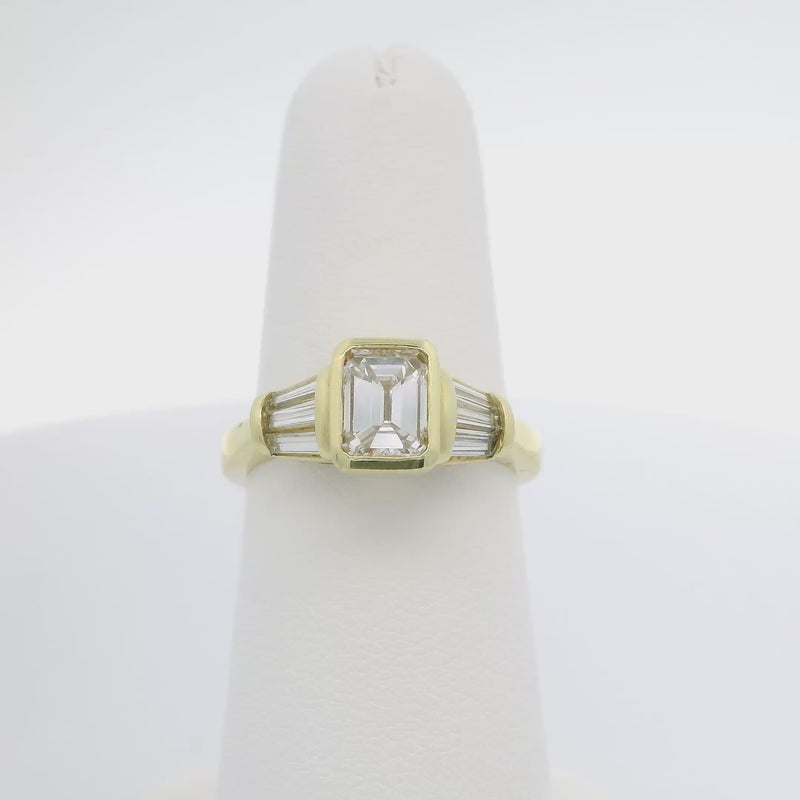 Timeless engagement ring style, crafted in 18k yellow gold and featuring a GIA certified emerald cut diamond in the center, set in a full bezel. This striking diamond is complimented by 3 baguette diamonds on each side. It is currently a size 6.75, but can easily be sized to accommodate your finger size.