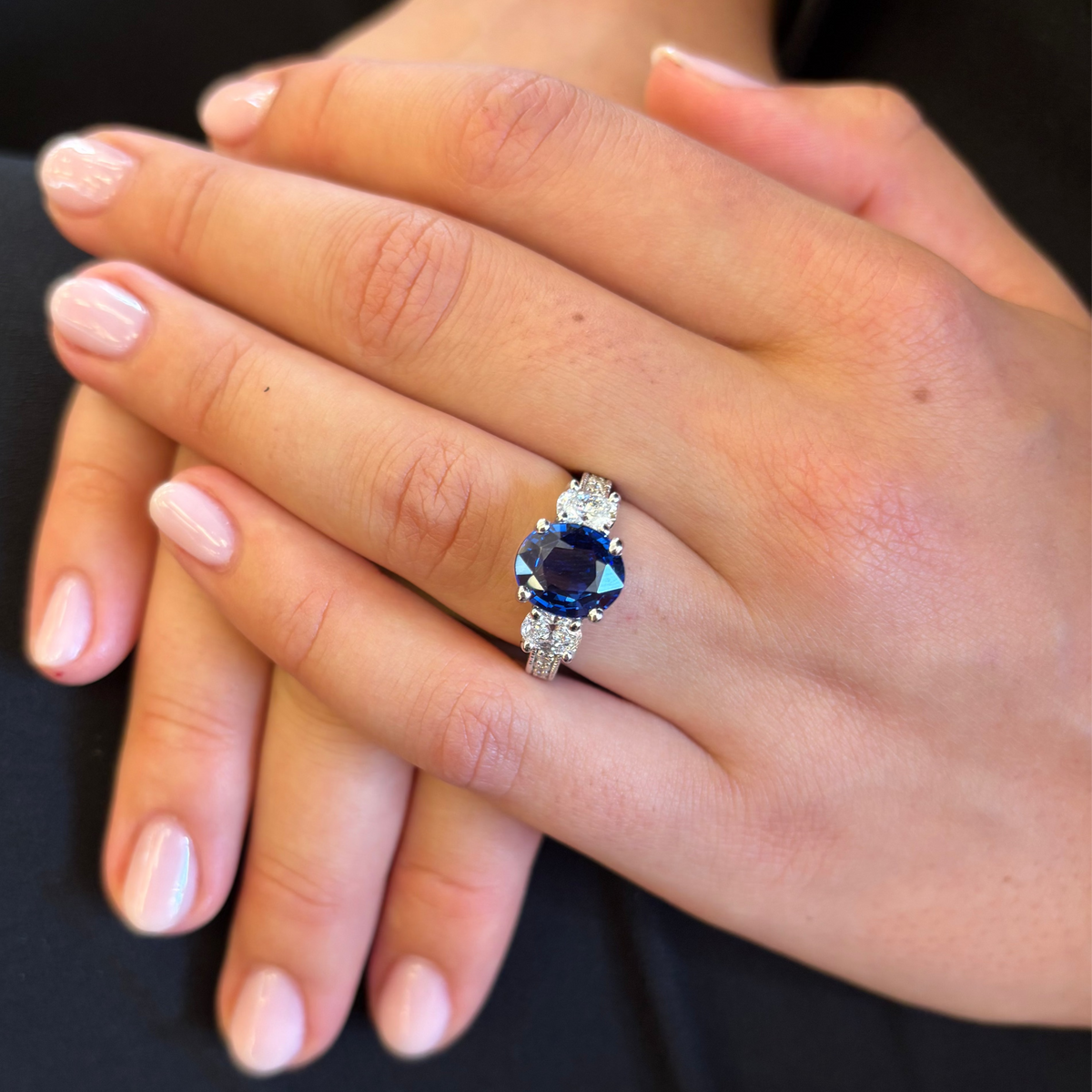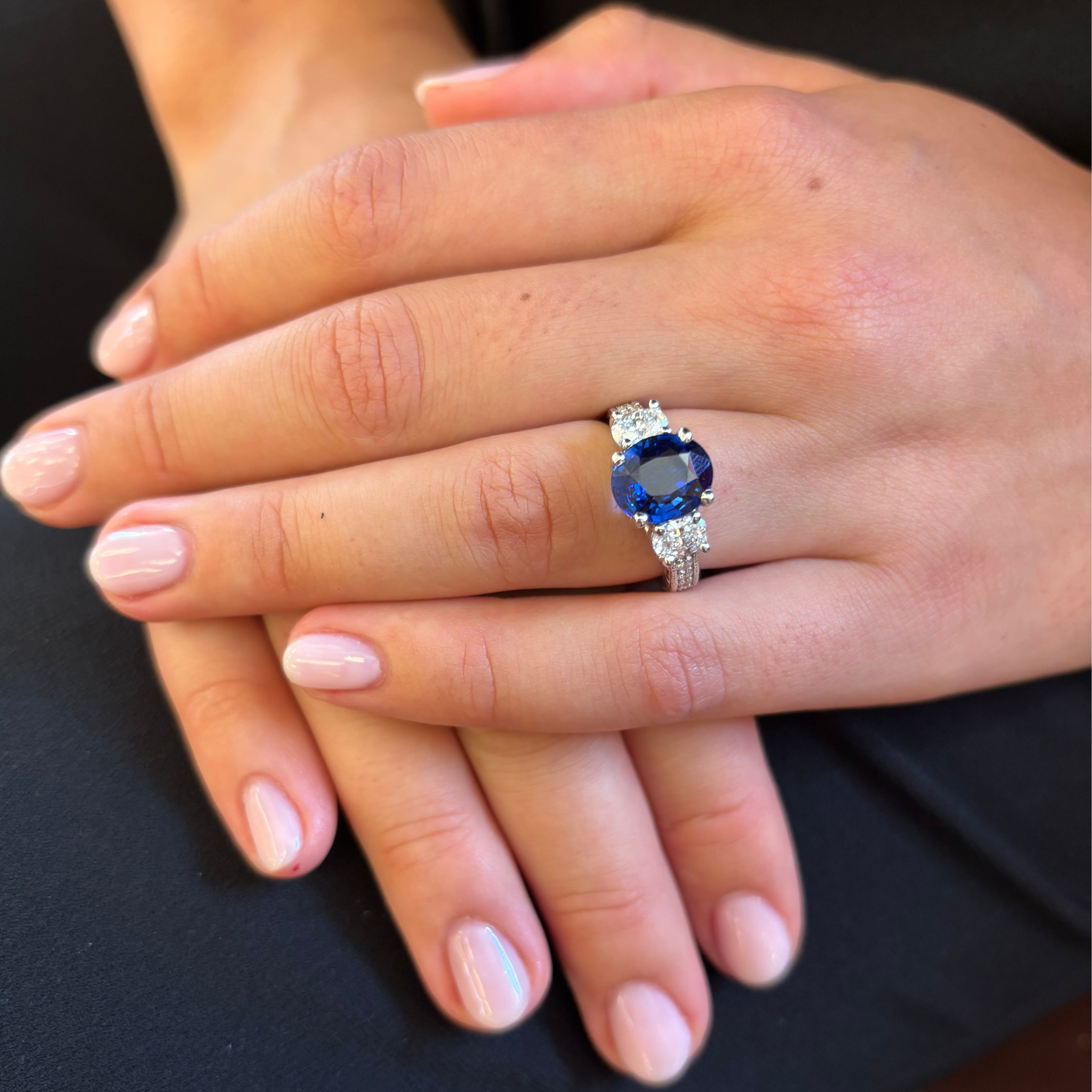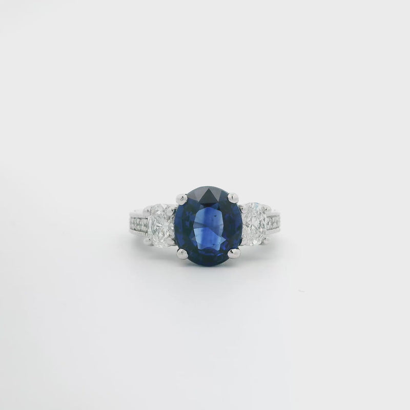 Indulge in the luxurious beauty of our Sapphire and Diamond Ring! Crafted in 14k white gold, this ring features a stunning 4.06 carat oval sapphire as its centerpiece. The two oval side diamonds, weighing a total of 0.70 carats, add an extra touch of elegance. With six additional diamonds on the shank, this ring is truly a showstopper.